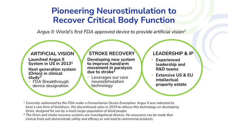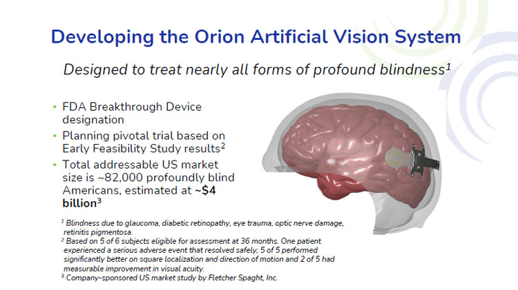 开发Orion人工视觉系统旨在治疗几乎所有形式的严重失明1 • FDA突破性设备认定•根据早期可行性研究结果规划关键试验2 •美国潜在市场总规模约为8.2万名严重失明的美国人,估计约为40亿美元31因青光眼、糖尿病视网膜病变、眼外伤、视神经损伤、视网膜色素变性导致的失明。2根据36个月时有资格接受评估的6个科目中的5个。1名患者经历了安全解决的严重不良事件;5名患者中有5名在正方形定位和运动方向方面表现明显更好,5名患者中有2名的视力有明显改善。3 Fletcher Spaght,Inc.公司赞助的美国市场研究。
