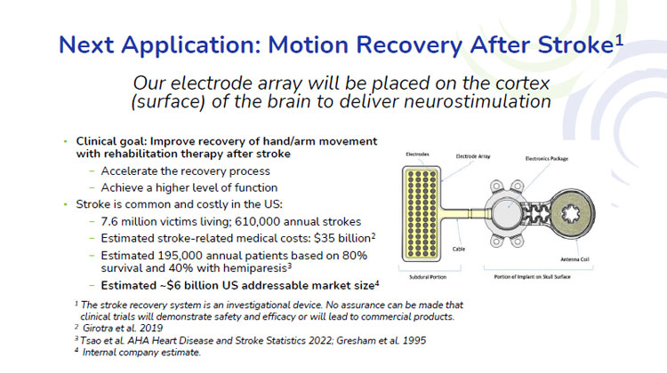下一个应用:中风后的运动恢复1我们的电极阵列将放置在大脑皮层(表面),以提供神经刺激•临床目标:通过中风后的康复疗法改善手/臂运动的恢复–加速恢复过程–实现更高水平的功能•中风在美国很常见,而且代价高昂:– 760万人活着;61万人每年中风–估计与中风相关的医疗费用:350亿美元2 –根据80%的生存率,估计每年有19.5万名患者40%患有偏瘫3 –估计约60亿美元美国潜在市场规模41卒中恢复系统是一种研究性设备。不能保证临床试验将证明安全性和有效性,或将导致产品商业化。2 Girotra et al. 20193 Tsao et al. AHA Heart Disease and Stroke Statistics 2022;Gresham et al. 19954 Internal company estimates。