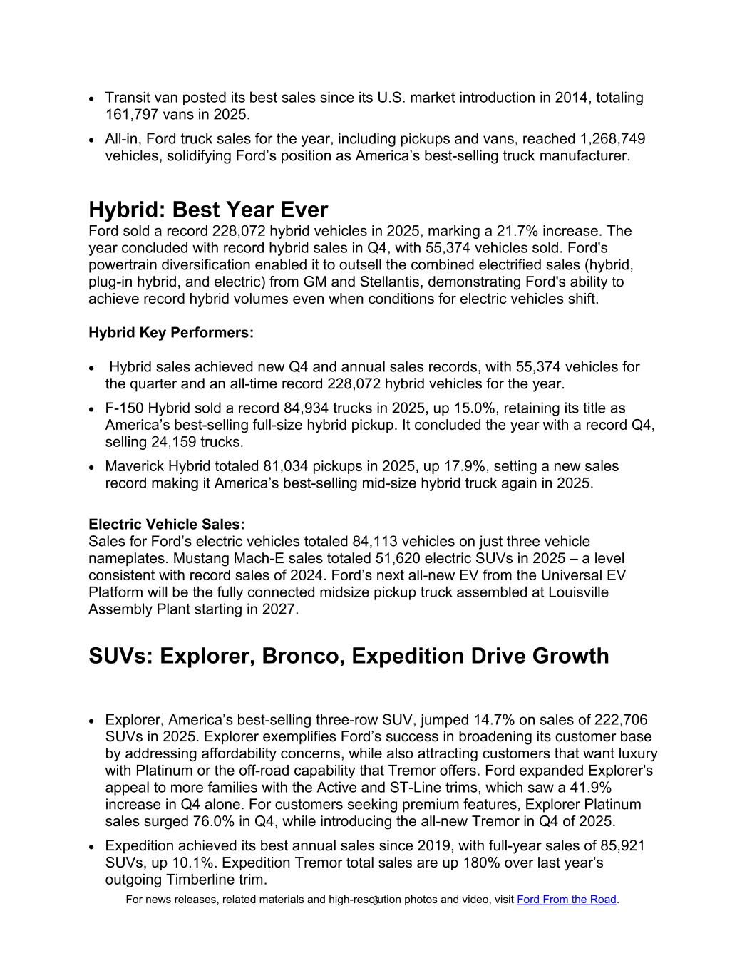 新闻发布、相关资料和高分辨率照片及视频,从公路上参观福特。3 • Transit van创下了自2014年引入美国市场以来的最佳销量,2025年总计161,797辆货车。•综合来看,包括皮卡和货车在内的福特卡车全年销量达到126.8749万辆,巩固了福特作为美国最畅销卡车制造商的地位。混合动力:有史以来最好的一年福特在2025年销售了创纪录的228,072辆混合动力汽车,增长了21.7%。第四季度混合动力销量创历史新高,销量达55,374辆。福特动力总成的多样化使其销量超过了通用汽车和Stellantis的电气化销量总和(混合动力、插电式混合动力和电动),这表明即使在电动汽车条件发生变化的情况下,福特也有能力实现创纪录的混合动力销量。混动关键表现:•混动销量创下Q4和年度销售新纪录,本季度销量为55,374辆,全年混动销量为228,072辆,创下历史新高。• F-150 Hybrid在2025年售出创纪录的84,934辆卡车,增长15.0%,保住了美国最畅销的全尺寸混合动力皮卡的称号。它以创纪录的第四季度结束了这一年,销售了24,159辆卡车。• Maverick Hybrid在2025年共有81,034辆皮卡,增长17.9%,创下新的销售纪录,使其在2025年再次成为美国最畅销的中型混合动力卡车。电动汽车销量:仅在三个汽车铭牌上,福特电动汽车的销量就达到了84,113辆。2025年,Mustang Mach-E的电动SUV销量总计51,620辆——这一水平与2024年的创纪录销量保持一致。福特从Universal EV平台推出的下一款全新EV将是从2027年开始在路易斯维尔装配厂组装的全连接中型皮卡。SUV:Explorer、Bronco、Expedition推动增长• Explorer,美国最畅销的三排SUV,2025年销量为222,706辆SUV,增长14.7%。Explorer体现了福特通过解决可负担性问题在扩大客户群方面取得的成功,同时也吸引了想要使用Platinum或Tremor提供的越野能力的豪华客户。福特通过Active和ST-Line的内饰扩大了Explorer对更多家庭的吸引力,仅在第四季度就增长了41.9%。对于寻求高端功能的客户,Explorer Platinum在Q4销量飙升76.0%,同时在2025年Q4推出了全新的Tremor。• Expedition实现了自2019年以来的最佳年度销量,全年SUV销量为85,921辆,增长10.1%。Expedition Tremor的总销量比去年即将推出的Timberline饰条增长了180%。