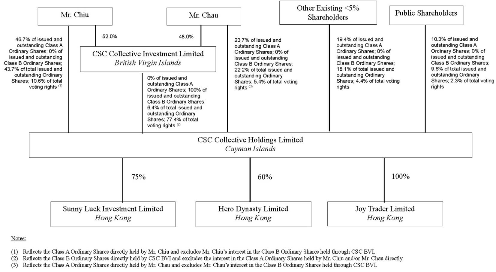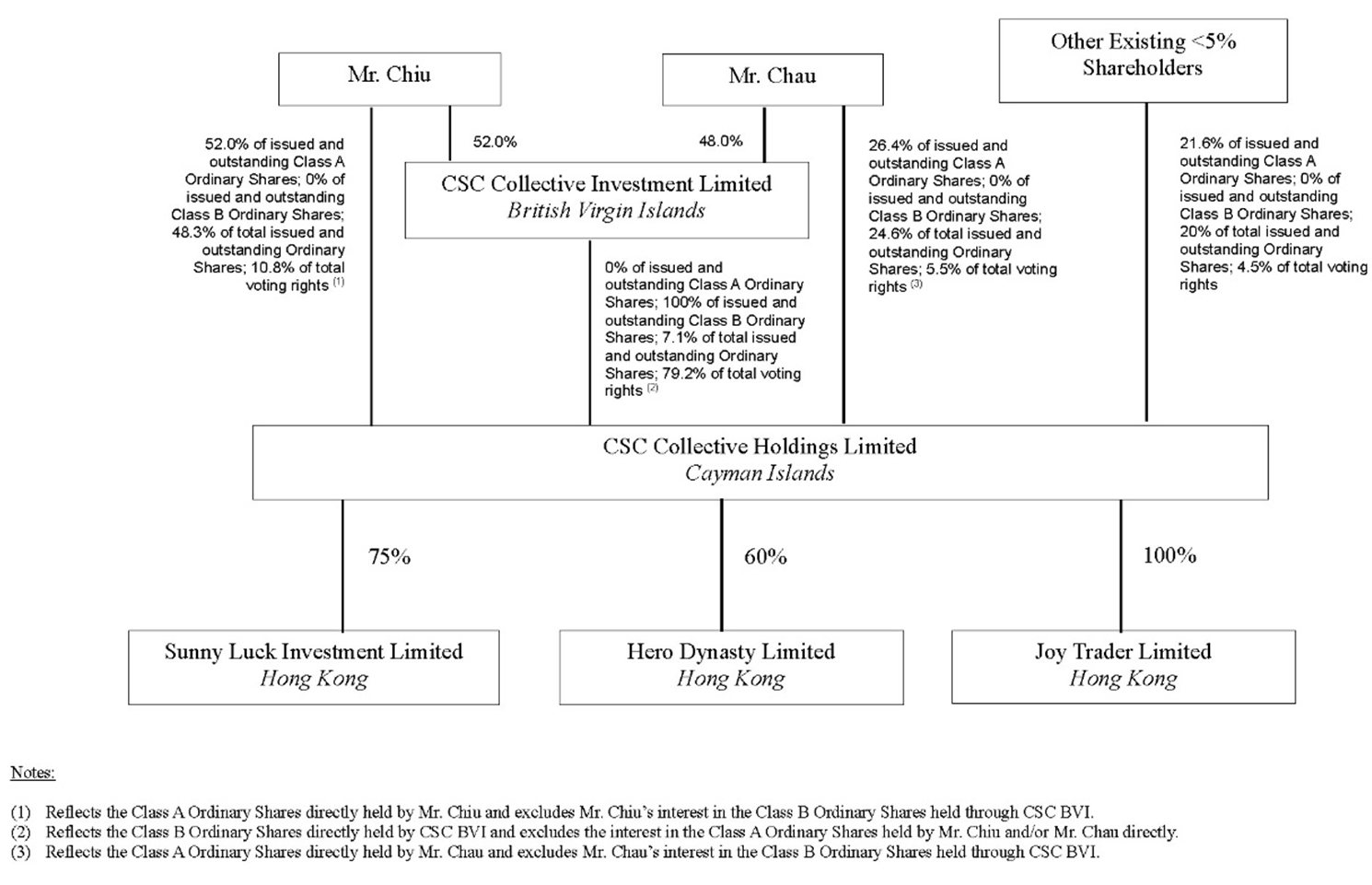 首次公开发行完成后,假设首次公开发行价格为每股4.00美元,CSC的流通股将包括14,625,000股A类普通股和1,000,000股B类普通股,假设承销商没有行使超额配股权,购买最多相当于根据本协议发售的A类普通股的15%的额外数量的A类普通股,或14,850,000股A类普通股,假设超额配股权全额行使。CSC将为《纳斯达克股票市场规则》所定义的“受控公司”,因为紧随本次首次公开发售完成后,我们的主席Lon Ronald Chiu(“Mr. Chiu”)及分别为我们的控股股东之一的Chun Pong Jonathan Chau(“Mr. Chau”)将直接或通过CSC Collective Investment Limited(“CSC BVI”)(由Chiu先生和Chau先生共同全资拥有和控制的实体)共同拥有已发行及流通的A类普通股和B类普通股总数的约72.3%,占总投票权的约93.3%,假设承销商不行使其超额配股权,或约占已发行及流通的A类普通股和B类普通股总数的71.3%,占总投票权的约93.0%,假设超额配股权全额行使。因此,Chiu先生和Chau先生将有能力控制或重大影响需要我们股东批准的事项的结果。不同的投票权也可能会产生反收购效应,阻止股东可能认为符合其最佳利益的控制权交易的变更。