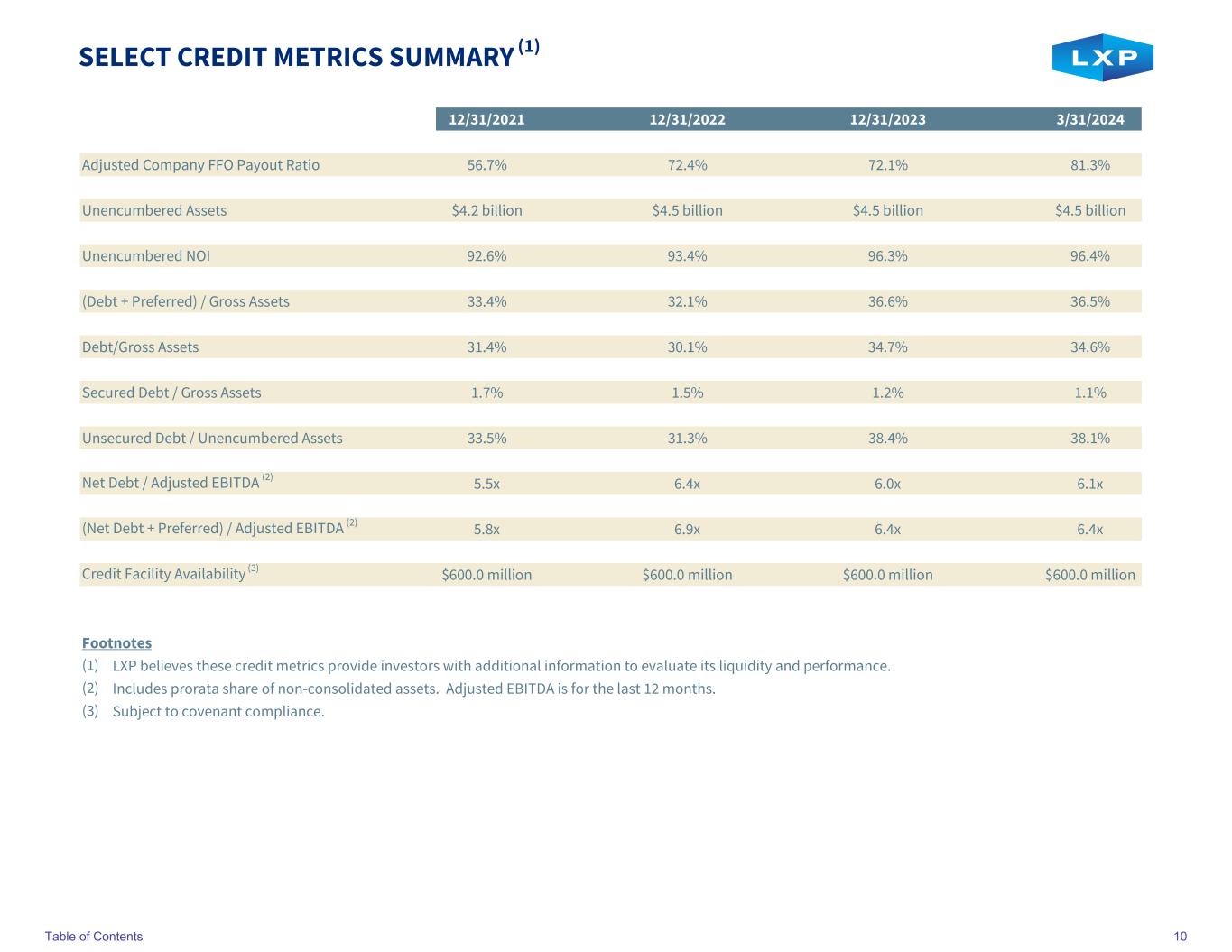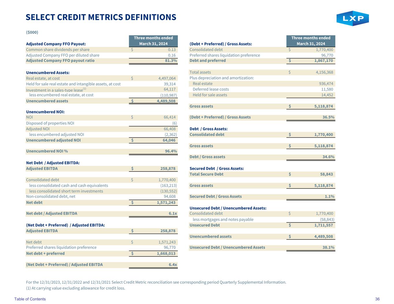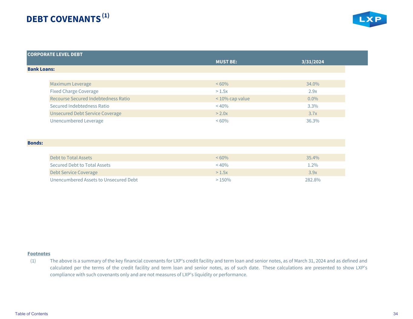 债务契约(1)公司层面债务必须是:3/31/2024最大杠杆< 60% 34.0%固定费用覆盖率> 1.5x 2.9x追索权有担保债务比率< 10%上限价值0.0%有担保债务比率< 40% 3.3%无担保偿债覆盖率> 2.0x 3.7x未设押杠杆< 60% 36.3%债务占总资产< 60% 35.4%有担保债务占总资产< 40% 1.2%偿债覆盖率> 1.5x 3.9x未设押资产占无担保债务> 150% 28 2.8%脚注(1)银行贷款:债券:以上是LXP信贷额度和定期贷款的主要财务契约摘要和优先票据,截至2024年3月31日,根据信贷安排和定期贷款及优先票据的条款定义和计算,截至该日期。这些计算旨在显示LXP对此类契约的遵守情况,而不是衡量LXP流动性或业绩的指标。目录34