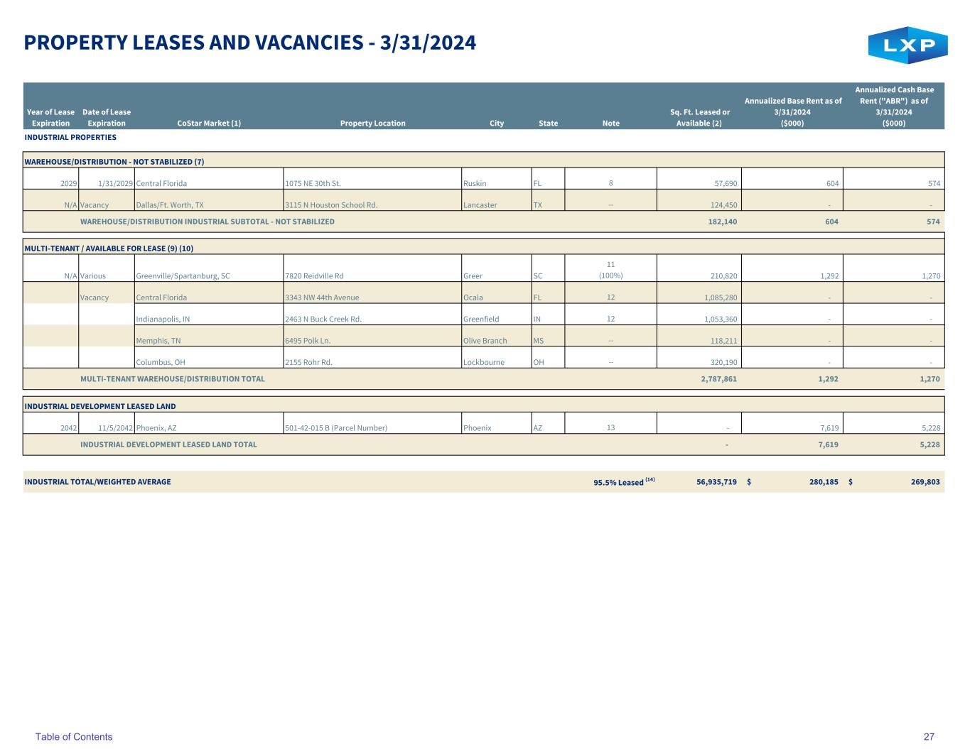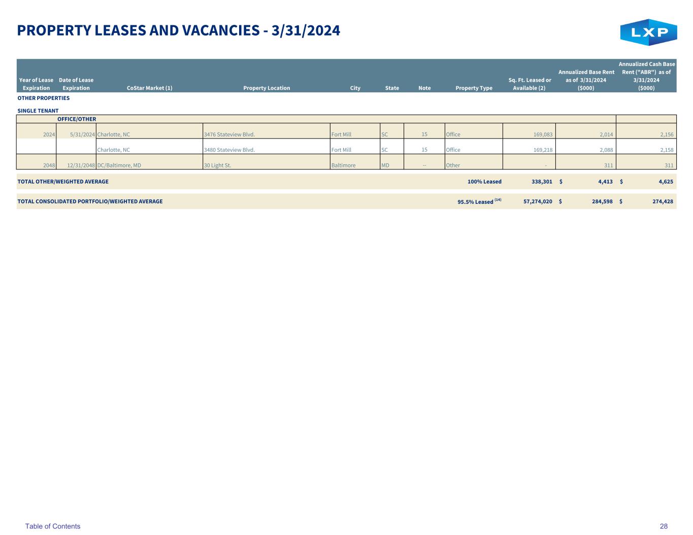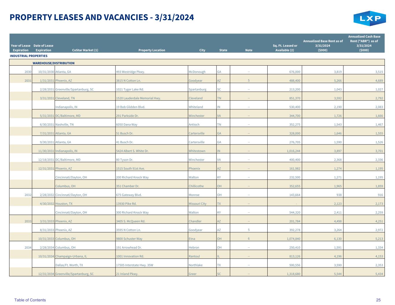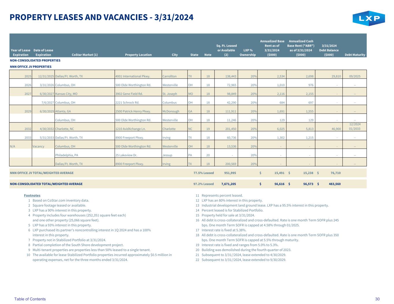 物业租赁及空缺-3/31/2024租约年份到期日租约到期CoStar Market(1)物业位置City State Note Sq。英尺。租赁或可用(2)截至2024年3月31日的LXP %所有权年化基础租金(000美元)截至2024年3月31日的年化现金基础租金(“ABR”)(000美元)2024年3月31日的债务余额(000美元)债务到期日非合并财产丨NNN丨厅合资财产202512/31/2025 Dallas/ft. Worth,TX 4001 International PKWY。Carrollton TX 18138,44320% 2,5342,69829,81009/202520263/31/2026 Columbus,OH 500 Olde Worthington Rd. Westerville OH 1872,96520% 1,0 10976---2027 6/30/2027 Kansas City,MO 3902 Gene Field Rd. St. Joseph MO 1898,84920% 2,1162,155---7/6/2027 Columbus,OH 2221 Schrock Rd. Columbus OH 1842,29020% 684697---2029 6/30/2029 Atlanta,GA 2500 Patrick Henry PKWY。McDonough GA 18111,91120% 1,6911,555---Columbus,OH 500 Olde Worthington Rd. Westerville OH 1811,24620% 129129---20324/30/2032 Charlotte,NC 1210 AvidXchange LN。Charlotte NC 19201,45020% 6,0255,81346,90012/202401/203320335/31/2033 Dallas/ft. Worth,TX8900 Freeport PKWY。Irving TX 1860,73620% 1,3021,215---N/A空缺Columbus,OH 500 Olde Worthington Rd. Westerville OH 1813,53620%-----Philadelphia,PA 25 Lakeview Dr. Jessup PA 20-20%-----Dallas/Ft. Worth,TX 8900 Freeport PKWY。Irving TX 18200,56920%-----NNN Office JV Total/weighted average 77.5% Leased 951,99515,491 $ 15,238 $ 76,710 $ Non-Consolidated Total/weighted average 97.2% Leased 7,671,20556,616 $ 56,573 $ 483,560 $ 11 Represents percent lease。1基于CoStar.com库存数据。12 LXP拥有该物业80%的权益。2平方英尺出租或可用。13工业发展用地地面租赁。LXP拥有该物业95.5%的权益。3 LXP拥有该物业90%的权益。租赁的14%用于稳定的投资组合。415于2024年3月31日持有待售物业。165 LXP拥有该物业93%的权益。617利率固定在5.38%。187于2024年3月31日不在稳定投资组合内的物业。8南岸开发项目部分完成。19利率固定,范围从5.0%到5.3%。9多租户物业为出租给单一租户的物业低于50%。20号楼在2023年第四季度被拆除。1021在3/31//2024之后,租约延长至4/30/2029。22在3/31//2024之后,租约延长至9/30/2029。可供出租的稳定投资组合物业产生约50万美元的运营费用,截至2024年3月31日止三个月的净额。所有债务都是交叉抵押和交叉违约的。利率为一个月期限SOFR加350个基点。1个月期限SOFR到期时上限为5.5%。Footnotes Property包括四个仓库(每个仓库252,351平方英尺)和一个其他物业(25,066平方英尺)。所有债务都是交叉抵押和交叉违约的。利率为一个月期限SOFR加245bps。截至01/2025,1个月期限SOFR上限为4.58%。LXP于2024年第一季度购买了其合作伙伴的非控股权益,并拥有该物业100%的权益。目录30