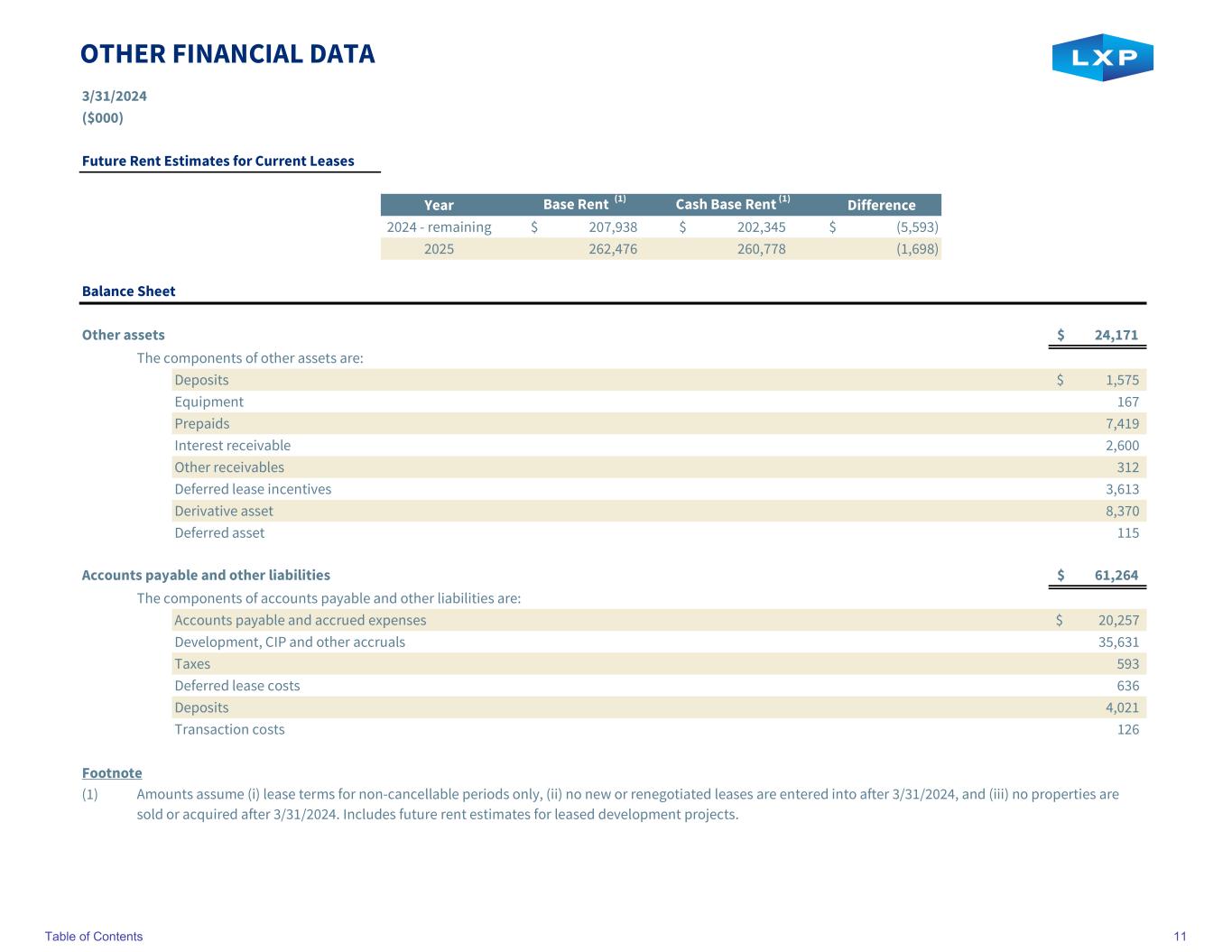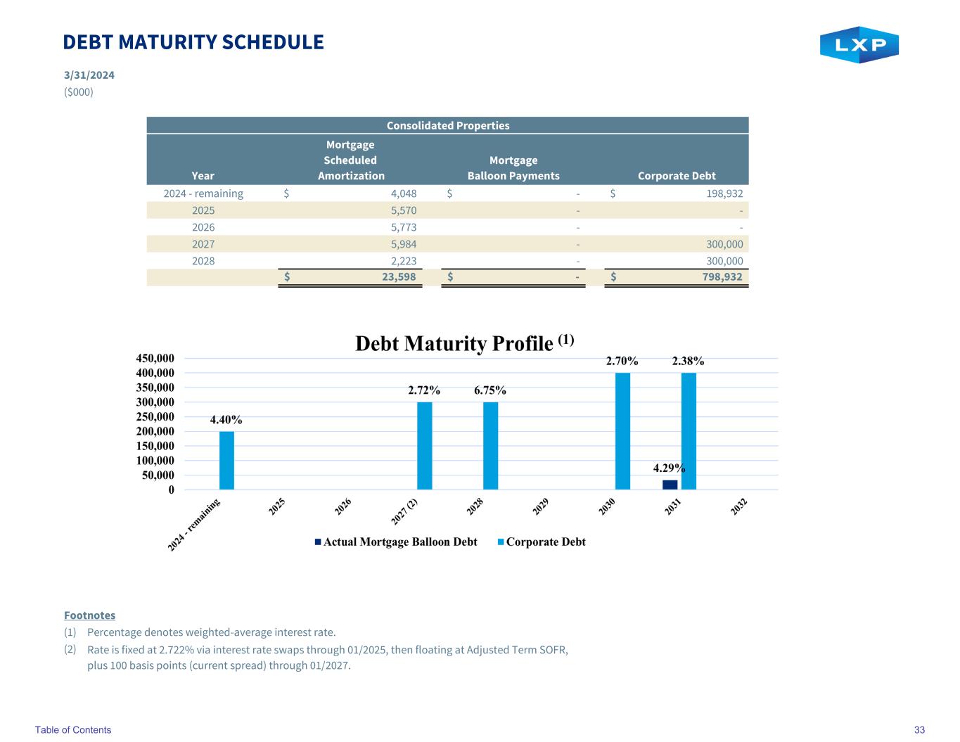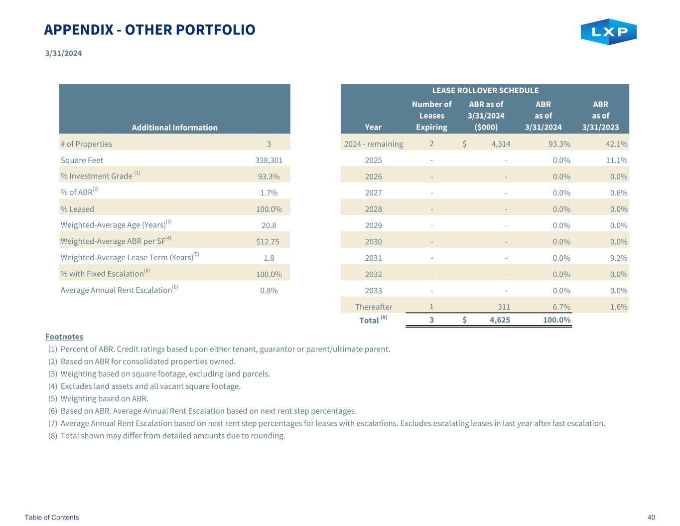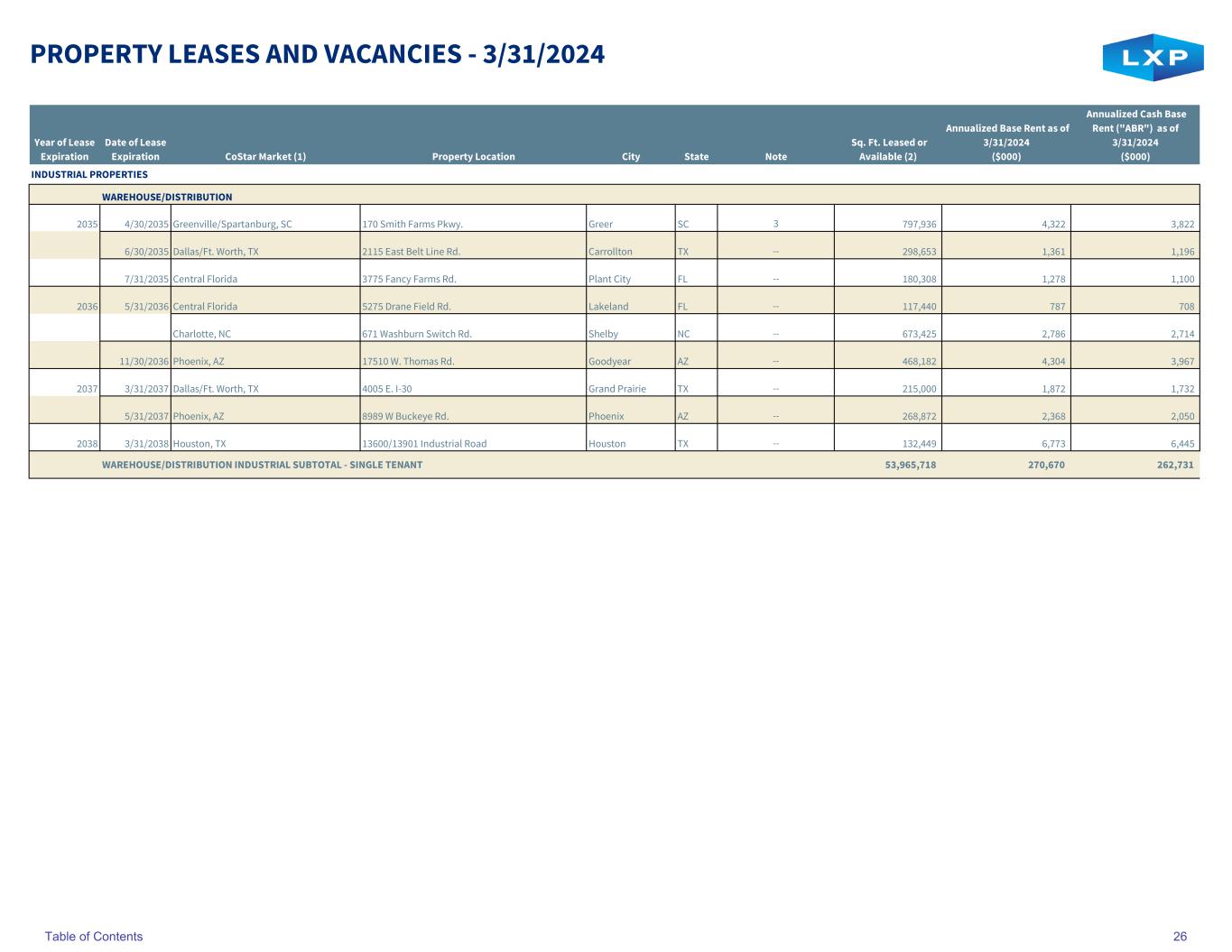物业租赁及空缺-3/31/2024租约年份到期日租约到期CoStar Market(1)物业位置City State Note Sq。英尺。租赁或可用(2)截至2024年3月31日的LXP %所有权年化基础租金(000美元)截至2024年3月31日的年化现金基础租金(“ABR”)(000美元)2024年3月31日的债务余额(000美元)债务到期日非合并财产丨NNN丨厅合资财产202512/31/2025 Dallas/ft. Worth,TX 4001 International PKWY。Carrollton TX 18138,44320% 2,5342,69829,81009/202520263/31/2026 Columbus,OH 500 Olde Worthington Rd. Westerville OH 1872,96520% 1,0 10976---2027 6/30/2027 Kansas City,MO 3902 Gene Field Rd. St. Joseph MO 1898,84920% 2,1162,155---7/6/2027 Columbus,OH 2221 Schrock Rd. Columbus OH 1842,29020% 684697---2029 6/30/2029 Atlanta,GA 2500 Patrick Henry PKWY。McDonough GA 18111,91120% 1,6911,555---Columbus,OH 500 Olde Worthington Rd. Westerville OH 1811,24620% 129129---20324/30/2032 Charlotte,NC 1210 AvidXchange LN。Charlotte NC 19201,45020% 6,0255,81346,90012/202401/203320335/31/2033 Dallas/ft. Worth,TX8900 Freeport PKWY。Irving TX 1860,73620% 1,3021,215---N/A空缺Columbus,OH 500 Olde Worthington Rd. Westerville OH 1813,53620%-----Philadelphia,PA 25 Lakeview Dr. Jessup PA 20-20%-----Dallas/Ft. Worth,TX 8900 Freeport PKWY。Irving TX 18200,56920%-----NNN Office JV Total/weighted average 77.5% Leased 951,99515,491 $ 15,238 $ 76,710 $ Non-Consolidated Total/weighted average 97.2% Leased 7,671,20556,616 $ 56,573 $ 483,560 $ 11 Represents percent lease。1基于CoStar.com库存数据。12 LXP拥有该物业80%的权益。2平方英尺出租或可用。13工业发展用地地面租赁。LXP拥有该物业95.5%的权益。3 LXP拥有该物业90%的权益。租赁的14%用于稳定的投资组合。415于2024年3月31日持有待售物业。165 LXP拥有该物业93%的权益。617利率固定在5.38%。187于2024年3月31日不在稳定投资组合内的物业。8南岸开发项目部分完成。19利率固定,范围从5.0%到5.3%。9多租户物业为出租给单一租户的物业低于50%。20号楼在2023年第四季度被拆除。1021在3/31//2024之后,租约延长至4/30/2029。22在3/31//2024之后,租约延长至9/30/2029。可供出租的稳定投资组合物业产生约50万美元的运营费用,截至2024年3月31日止三个月的净额。所有债务都是交叉抵押和交叉违约的。利率为一个月期限SOFR加350个基点。1个月期限SOFR到期时上限为5.5%。Footnotes Property包括四个仓库(每个仓库252,351平方英尺)和一个其他物业(25,066平方英尺)。所有债务都是交叉抵押和交叉违约的。利率为一个月期限SOFR加245bps。截至01/2025,1个月期限SOFR上限为4.58%。LXP于2024年第一季度购买了其合作伙伴的非控股权益,并拥有该物业100%的权益。目录30
