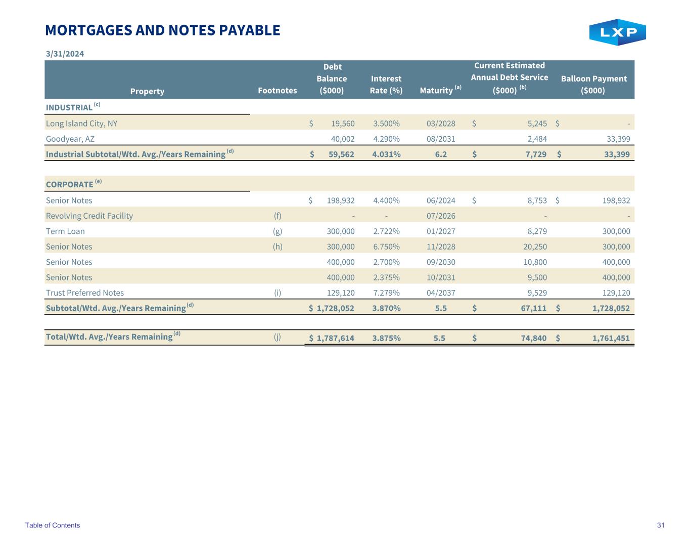 抵押贷款和应付票据脚注债务余额(000美元)利率(%)期限(a)当前估计年度还本付息(000美元)(b)气球支付(000美元)工业(c)长岛市,NY 19,560 $ 3.500% 03/20285,245 $-$固特异,AZ 40,0024.290% 08/20312,48433,39959,562 $ 4.031% 6.27,729 $ 33,399 $公司(e)优先票据198,932 $ 4.400% 06/20248,753 $ 198,932 $循环信贷融资(f)--07/2026--定期贷款(g)300,0002.722% 01/20278,279300,000优先票据(h)300,0006.750% 11/202820,250300,000优先票据400,0002.700% 09/203010,800400,000优先票据400,0002.375% 10/20319,500400,000信托优先票据(i)129,1207.279% 04/20379,529129,1201,728,052 $ 3.8 70% 5.567,111 $ 1,728,052 $平均/年剩余(d)(j)1,787,614美元3.875% 5.574,840美元1,761,451美元小计/WTD。Avg./Years Remaining(d)3/31/2024 Property Industrial小计/WTD。平均/年剩余(d)目录31