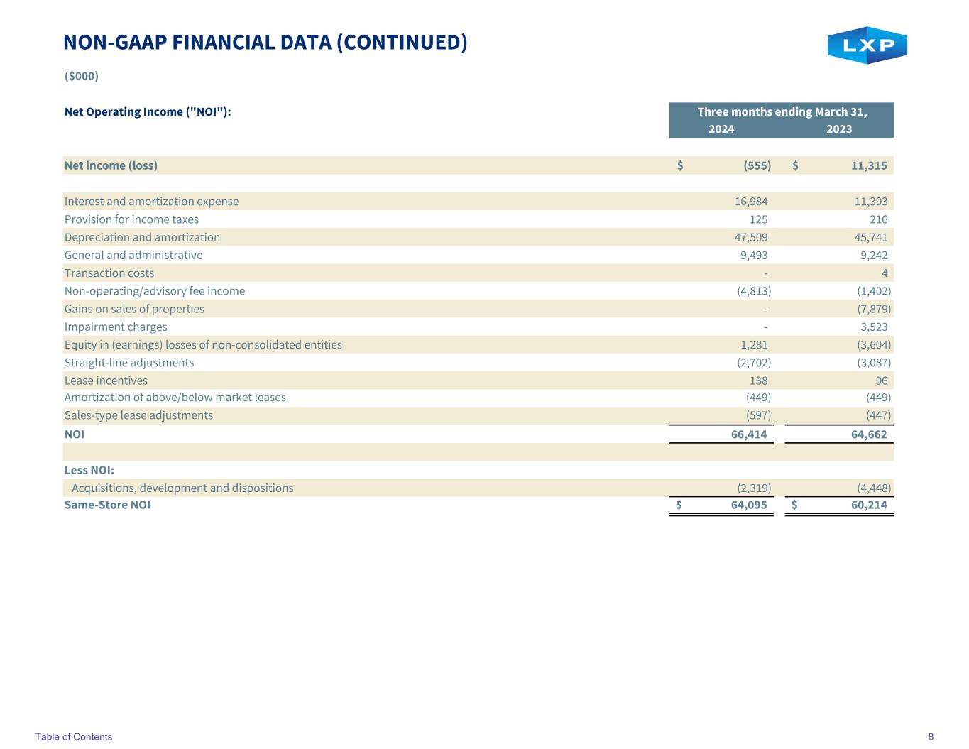 非美国通用会计准则财务数据(续)(000美元)净营业收入(“NOI”):20242023净收入(亏损)(555)$ 11,315 $利息和摊销费用16,98411,393所得税准备金125216折旧和摊销47,50945,741一般和行政费用9,4939,242交易成本-4营业外/咨询费收入(4,813)(1,402)出售物业的收益-(7,879)减值费用-3,523非合并实体的权益(收益)损失1,281(3,604)直线调整(2,702)(3,087)租赁奖励13896高于/低于市场租赁的摊销(449)(449)销售型租赁调整(597)(447)NOI开发和处置(2,319)(4,448)同店NOI 64,095 $ 60,214 $截至3月31日的三个月,目录8