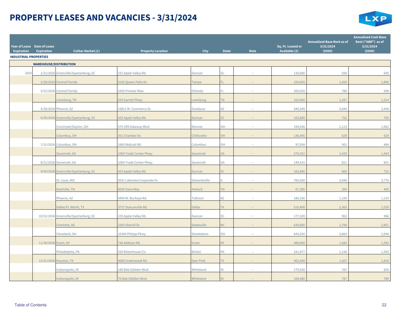 物业租赁及空缺-3/31/2024租约年份到期日租约到期CoStar Market(1)物业位置City State Note Sq。英尺。租赁或可用(2)截至2024年3月31日的年化基础租金(000美元)截至2024年3月31日的年化现金基础租金(“ABR”)(000美元)工业物业仓库/分布20261/31/2026 Greenville/Spartanburg,SC 231 Apple Valley Rd. Duncan SC--120,6805986502/28/2026 Central Florida 3102 Queen Palm Dr. Tampa FL-229,6051,6931,8063/31/2026 Central Florida 2455 Premier Row Orlando FL-205,016786508 Lewisburg,TN 633 Garrett PKWY。Lewisburg TN--310,0001,2871,3144/30/2026 Phoenix,AZ 16811 W. Commerce Dr. Goodyear AZ--540,3492,4442,4586/30/2026 Greenville/Spartanburg,SC 425 Apple Valley Rd. Duncan SC--163,680752769 Cincinnati/Dayton,OH 575-599 Gateway Blvd. Monroe OH--194,9361,1131,062 Columbus,OH 351 Chamber Dr. Chillicothe OH--136,4956296297/31/2026 Columbus,OH 1860 Walcutt Rd. Columbus OH--97,934501494Savannah GA--270,2521,4331,4438/31/2026 Savannah,GA 1004贸易中心PKWY。Savannah GA--149,4158218419/30/2026 Greenville/Spartanburg,SC 425 Apple Valley Rd. Duncan SC--163,680669722 St. Louis,MO 3931 Lakeview Corporate Dr. Edwardsville IL--769,526962,776 Nashville,TN 6050 达纳 Way TERM0 Antioch TN--67,200394405 Phoenix,AZ 9494 W. Buckeye Rd. Tolleson AZ--186,3361,1091,135 Dallas/ft. Worth,TX 3737 Duncanville Rd. Dallas TX--510,4002,3652,52610/31/2026 Greenville/Spartanburg,SC 235 Apple ValStreetsboro OH--649,2502,8832,95811/30/2026 Erwin,NY 736 Addison Rd. Erwin NY--408,0001,5841,592 Philadelphia,PA 250 Rittenhouse Cir。Bristol PA--241,9771,1461,30312/31/2026 Houston,TX 4600 Underwood Rd. Deer Park TX--402,6481,5071,816 Indianapolis,in 180 Bob Glidden Blvd. Whiteland IN--179,530787820 Indianapolis,in 76 Bob Glidden Blvd. Whiteland IN--168,480787789目录22