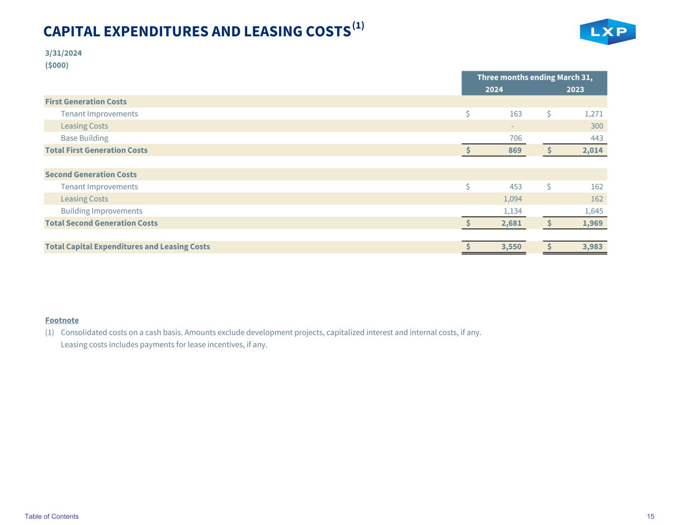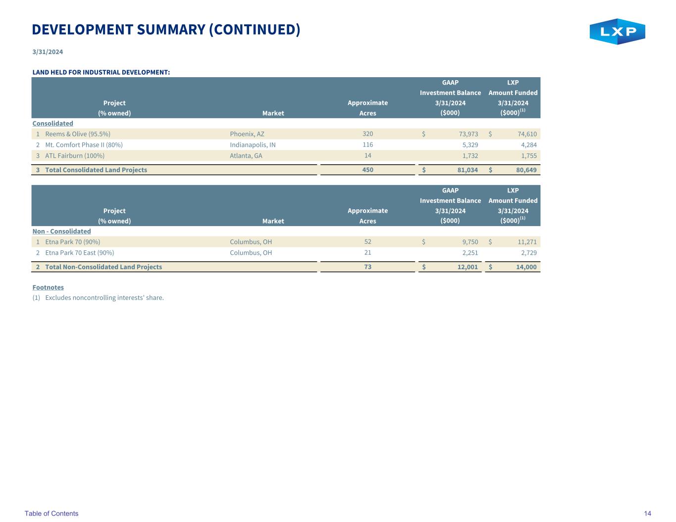 发展摘要(续)为工业发展而持有的土地:GAAP LXP投资余额金额资助项目3/31/20243/31/2024(拥有百分比)市场($000)($000)(1)合并1 Reems & Olive(95.5%)Phoenix,AZ 73,973 $ 74,610 $ 2 Mt. Comfort Phase II(80%)Indianapolis,in 5,3294,2843 ATL Fairburn(100%)Atlanta,GA 1,7321,7553合并土地项目总额81,034 $ 80,649 $ GAAP LXP投资余额金额资助项目3/31/20243/31/2024(拥有百分比)市场(OH 2,2512,7292非合并土地项目总额12,001 $ 14,000 $脚注(1)不包括非控制性权益的份额。7352213/31/2024约英亩320116约英亩45014目录14