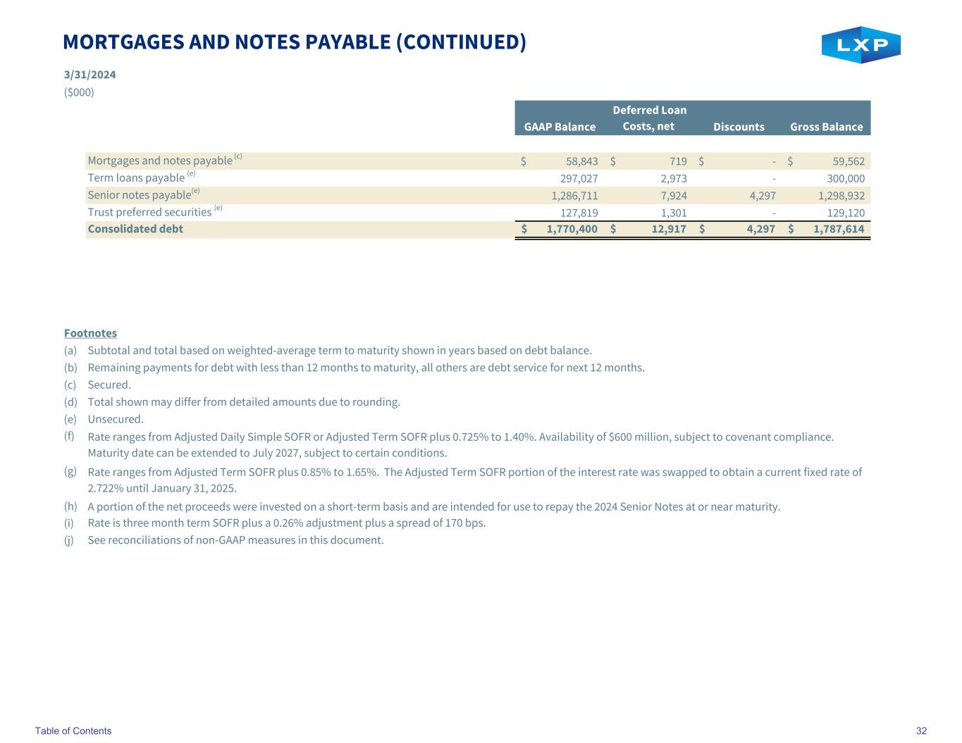 应付抵押贷款和票据(续)(000美元)GAAP余额递延贷款成本、净折扣总余额抵押贷款和应付票据(c)58,843 $ 719 $-$ 59,562 $定期贷款应付(e)297,0272,973-300,000优先应付票据(e)1,286,7117,9244,2971,298,932信托优先证券(e)127,8191,301-129,120合并债务1,770,400美元12,917美元4,297美元1,787,614美元(a)小计和总额基于债务余额的年份显示的加权平均到期期限。(b)对到期未满12个月的债务的剩余支付,其他均为未来12个月的还本付息。(c)担保。(d)由于四舍五入,显示的总额可能与详细数额不同。(e)无担保。(f)(g)(h)部分所得款项净额作短期投资,拟用于在或接近到期时偿还2024年优先票据。(i)利率为三个月期限SOFR加上0.26%的调整加上170个基点的利差。(j)请参阅本文件中非GAAP措施的对账。Footnotes 3/31/2024 rate ranges from adjusted daily simple SOFR or adjusted term SOFR plus 0.725% to 1.40%。可用6亿美元,以遵守契约为准。到期日可延长至2027年7月,但须符合特定条件。利率从调整后的期限SOFR加0.85%到1.65%不等。利率的调整后期限SOFR部分进行互换,获得当前2.722%的固定利率,直至2025年1月31日。目录32