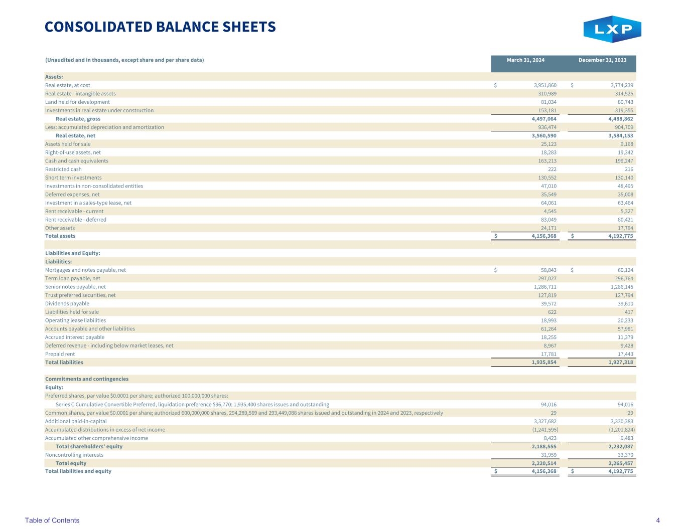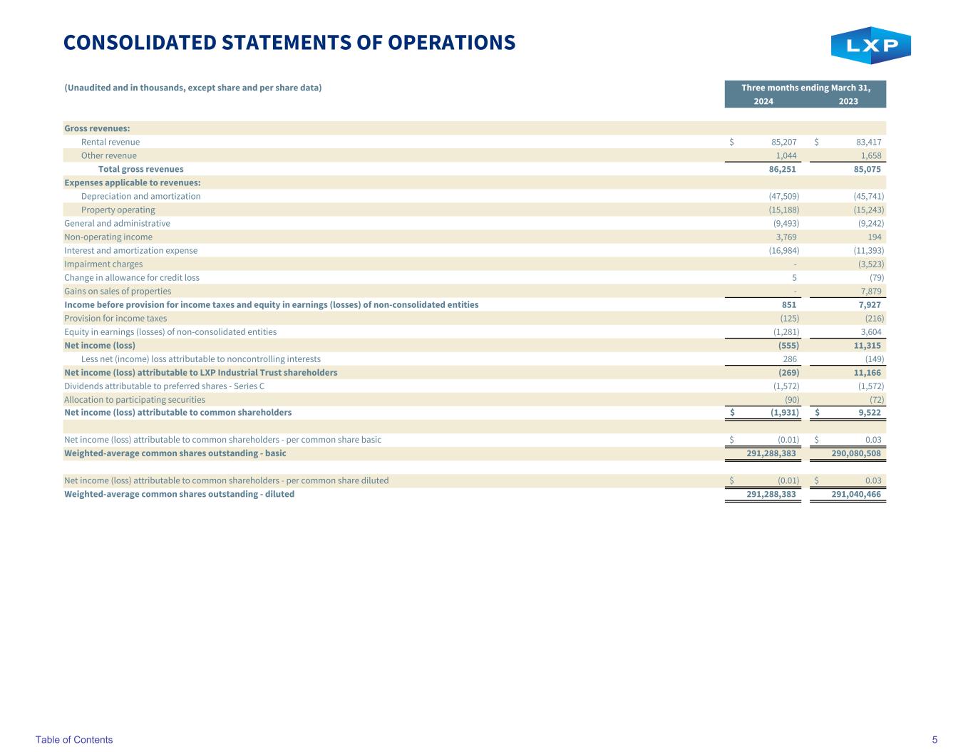 合并经营报表(未经审计,单位:千,20242023总收入:租金收入85,207美元83,417美元其他收入1,0441,658总收入86,25185,075适用于收入的费用:折旧和摊销(47,509)(45,741)物业经营(15,188)(15,243)一般和行政(9,493)(9,242)营业外收入3,769 194利息和摊销费用(16,984)(11,393)减值费用-(3,523)信用损失准备变化5(79)出售物业收益-7,879所得税拨备前收入非合并实体收益(亏损)中的权益8517,927拨备所得税(125)(216)非合并实体收益(亏损)中的权益(1,281)3,604净收益(亏损)(555)11,315减去归属于非控股权益的净(收益)亏损286(149)归属于LXP Industrial Trust股东的净利润(亏损)(269)11,166归属于优先股的股息-C系列(1,572)(1,572)分配给参与证券(90)(72)归属于普通股股东的净利润(亏损)(1,931)(72)$ 9,522 $归属于普通股股东的净利润(亏损)-每股普通股基本(0.01)$ 0.03 $加权平均已发行普通股-基本291,288,383290,080,508归属于普通股股东的净利润(亏损)-稀释后每股普通股(0.01)$0.03美元加权平均已发行普通股-稀释后291,288,383291,040,466截至3月31日的三个月,目录5