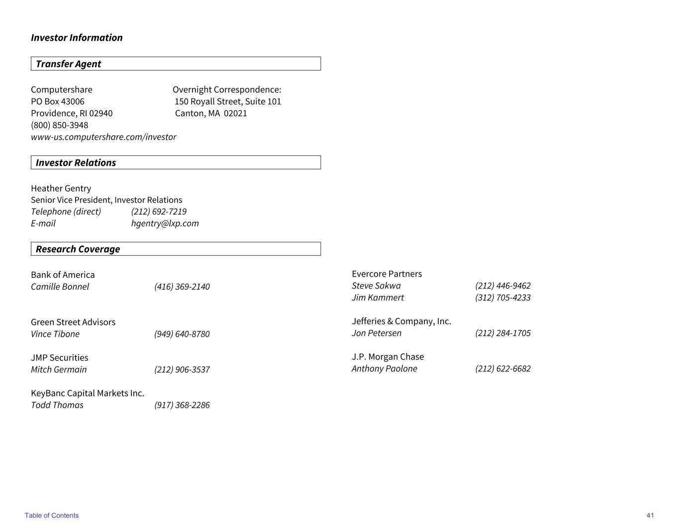 投资者信息传输代理Computershare隔夜通讯:PO Box 43006150 Royall Street,Suite 101 Providence,RI 02940 Canton,MA 02021(800)850-3948 www-us.computershare.com/投资者关系Heather Gentry投资者关系高级副总裁电话(直接)(212)692-7219 E-mail hgentry@lxp.com研究覆盖美国银行Camille Bonnel(416)369-2140 Green Street Advisors Vince Tibone(949)640-8780 JMP Securities Mitch Germain(212)906-3537 KeyBanc Capital Markets Inc. Todd Thomas(917)368-2286 Evercore Partners Steve Sakwa(212)446-9462 Jim Kammert(312)705-4233 Jefferies & Company,