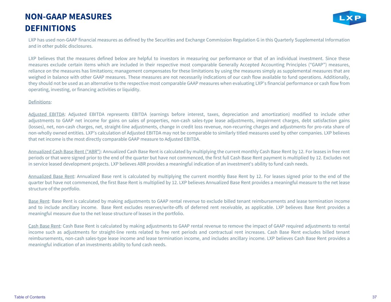 NON-GAAP措施定义LXP在本季度补充信息和其他公开披露中使用了美国证券交易委员会条例G定义的非GAAP财务措施。LXP认为,以下定义的衡量标准有助于投资者衡量我们的业绩或个人投资的业绩。由于这些措施不包括包含在其各自最具可比性的公认会计原则(“GAAP”)措施中的某些项目,因此对这些措施的依赖具有局限性;管理层通过将这些措施简单地用作与其他GAAP措施权衡的补充措施来补偿这些局限性。这些衡量指标并不一定表明我们可用于为运营提供资金的现金流。此外,在评估LXP的财务业绩或经营、投资或融资活动产生的现金流或流动性时,不应将它们用作各自最具可比性的公认会计原则衡量标准的替代方案。定义:调整后EBITDA:调整后EBITDA是指EBITDA(利息、税项、折旧和摊销前利润),经修改后包括对出售物业收益、非现金销售类型租赁调整、减值费用、债务清偿收益(损失)、净额、非现金费用、净额、直线调整、信用损失收入变化、非经常性费用和非全资实体按比例份额调整的GAAP净收入的其他调整。LXP对调整后EBITDA的计算可能无法与其他公司使用的类似标题的衡量标准进行比较。LXP认为,净收入是与调整后EBITDA最直接可比的GAAP衡量标准。年化现金基础租金(“ABR”):年化现金基础租金的计算方法是将当前每月现金基础租金乘以12。对于处于免费租期的租约或在季度末之前签署但尚未开始的租约,首次全额现金基础租金付款乘以12。不包括不在服务租赁开发项目中。LXP认为ABR提供了一项投资为现金需求提供资金的能力的有意义的指标。年化基租:年化基租按当前月基租乘以12。季度末前签订但未开工的租约,首期基本租金乘以12。LXP认为,年化基础租金为投资组合的净租赁结构提供了一个有意义的衡量标准。基本租金:基本租金的计算方法是对GAAP租金收入进行调整,以排除已计费的租户报销和租赁终止收入,并包括辅助收入。基本租金不包括递延应收租金的准备金/注销(如适用)。LXP认为,由于投资组合中租赁的净租赁结构,基本租金提供了一个有意义的衡量标准。现金基础租金:现金基础租金的计算方法是对GAAP租金收入进行调整,以消除GAAP要求的租金收入调整的影响,例如与免费租期和合同租金上涨相关的直线租金调整。现金基础租金不包括账单租户报销、非现金销售类租赁收入和租赁终止收入,并包括辅助收入。LXP认为,现金基础租金提供了一个有意义的指标,表明投资能力能够为现金需求提供资金。目录37