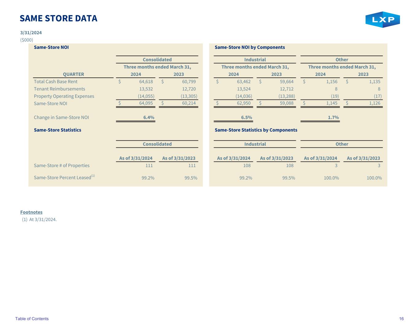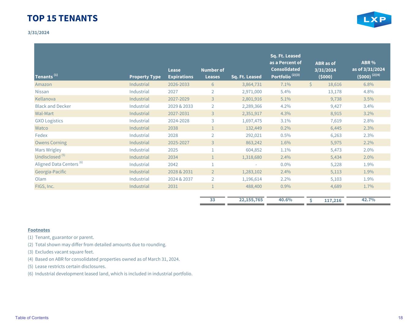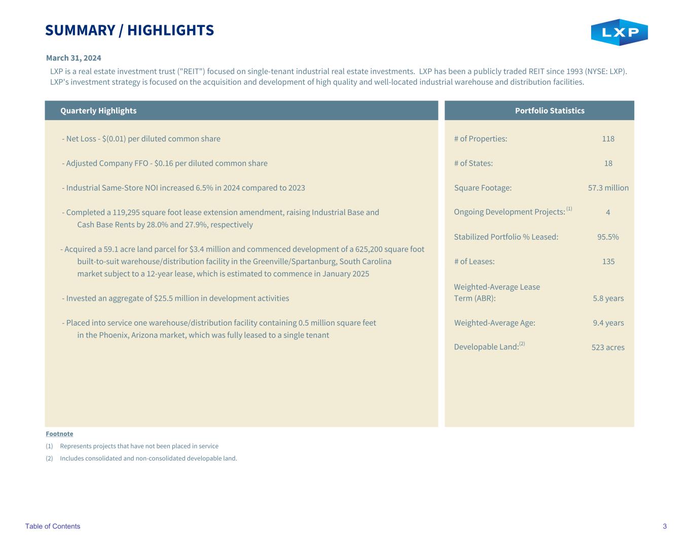 摘要/要点2024年3月31日季度亮点投资组合统计-净亏损--(0.01)美元/稀释后的普通股#物业:118-调整后的公司FFO--0.16美元/稀释后的普通股#各州:18-与2023年相比,2024年工业同店NOI增加了6.5%面积:5730万-完成了119,295平方英尺的租约延期修正,提高了工业基础和正在进行的开发项目:(1)4现金基础租金增加28.0%和27.9%,分别稳定的投资组合%租赁:95.5%-以340万美元收购一块59.1英亩的地块,并开始在南卡罗来纳州格林维尔/斯巴达堡开发一个625,200平方英尺的定制仓库/配送设施#租赁:135市场受制于12年的租约,估计将于2025年1月开始--在开发活动中投资总计2550万美元5.8年-投入使用一个包含50万平方英尺的仓库/配送设施加权平均年限:亚利桑那州凤凰城市场9.4年,全部出租给单一租户的可开发土地:(2)523英亩脚注(1)代表尚未投入使用的项目(2)包括合并和非合并的可开发土地。加权-平均租赁期限(ABR):LXP是一家房地产投资信托基金(“REIT”),专注于单租户工业房地产投资。自1993年以来,LXP一直是一只公开交易的房地产投资信托基金(纽约证券交易所代码:LXP)。LXP的投资策略专注于收购和开发优质且位置优越的工业仓库和配送设施。目录3