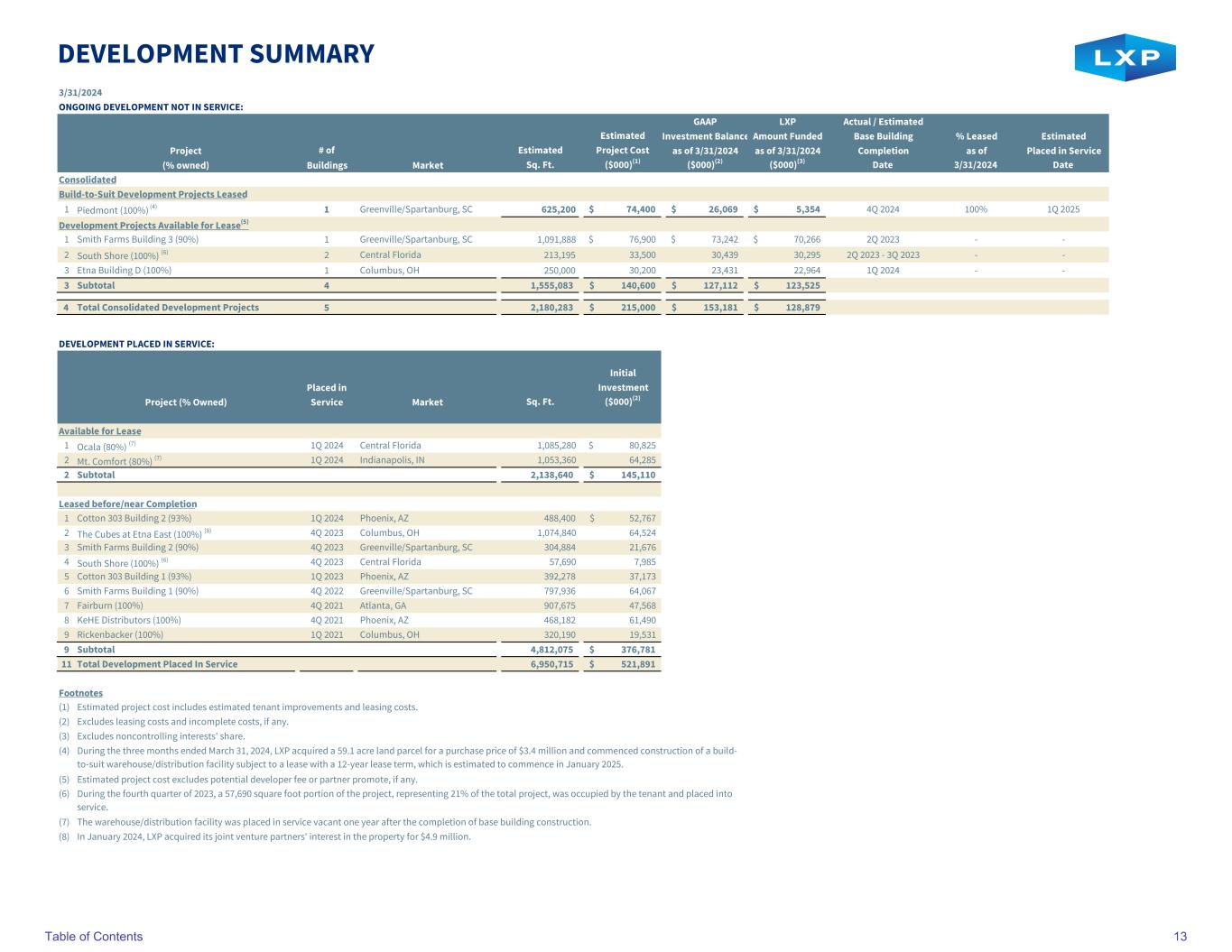 发展概要进行中的发展未服务:GAAP LXP实际/估计估计估计投资余额金额资助的基地楼%截至2024年3月31日的估计项目成本的租赁估计项目#截至2024年3月31日的投入使用的完成情况(拥有百分比)建筑物市场SQ。FT.($000)(1)($000)(2)($000)(3)日期3/31/2024日期租赁的综合建造到适合的开发项目1 Piedmont(100%)(4)1 Greenville/Spartanburg,SC 625,20074,400 $ 26,069 $ 5,354 $ Q4 2024 100% 1Q2025可供出租的开发项目(5)1 Smith Farms Building 3(90%)1 Greenville/Spartanburg,SC 1,091,88876,900 $ 73,242 $ 70,266 $ 2Q1 2023--2 South Shore(100%)(6)2 Central Florida 213,19533,50030,43930,295 2Q1 2023-Q3 2023--3 Etna Building D(100%)1 Columbus,OH 250,00030,20023,43122,964 2024年第一季度--3小计41,555,083140,600美元127,112美元123,525美元4合并发展项目总额52,180,283215,000美元153,181美元128,879美元已投入服务的发展:已投入投资项目(拥有百分比)服务市场SQ。英尺(000美元)(2)可供出租1 Ocala(80%)(7)2024年第一季度佛罗里达州中部1,085,28080,825美元2吨舒适度(80%)(7)2024年第一季度印第安纳波利斯,1,053,36064,2852小计2,138,640145,110美元在完工前/接近完工时租赁1 Cotton 303 Building 2(93%)2024年第一季度Phoenix,AZ 488,40052,767 $ 2 The Cubes at Etna East(100%)(8)2023年第四季度哥伦布,OH 1,074,84064,5243 Smith Farms Building 2(90%)2023年第四季度Greenville/Spartanburg,SC 304,88421,6764 South Shore(100%)(6)2023年第四季度佛罗里达州中部57,6907,AZ 392,27837,1736 Smith Farms Building 1(90%)2022年第四季度Greenville/Spartanburg,SC 797,93664,0677 Fairburn(100%)2021年第四季度佐治亚州亚特兰大907,67547,5688 KeHE分销商(100%)2021年第四季度亚利桑那州凤凰城468,18261,4909 Rickenbacker(100%)2021年第一季度俄亥俄州哥伦布市320,19019,5319小计4,812,075376,781美元11投入使用的开发总额6,950,715521,891美元脚注(1)估计项目成本包括估计租户改善和租赁成本。(2)不包括租赁费用和不完整费用(如有)。(3)不包括非控制性权益的份额。(4)(5)预计项目成本不包括潜在的开发商费用或合作伙伴推广(如有)。(6)(7)仓库/配送设施在基地大楼建设完成一年后空置投入使用。(8)2024年1月,LXP以490万美元收购其合资伙伴在该物业的权益。3/31/2024在截至2024年3月31日的三个月内,LXP收购了一块59.1英亩的地块,购买价格为340万美元,并开始建造一个按需建造的仓库/配送设施,但须遵守为期12年的租约,估计将于2025年1月开始。在2023年第四季度期间,该项目的57,690平方英尺部分,占总项目的21%,被租户占用并投入使用。目录13