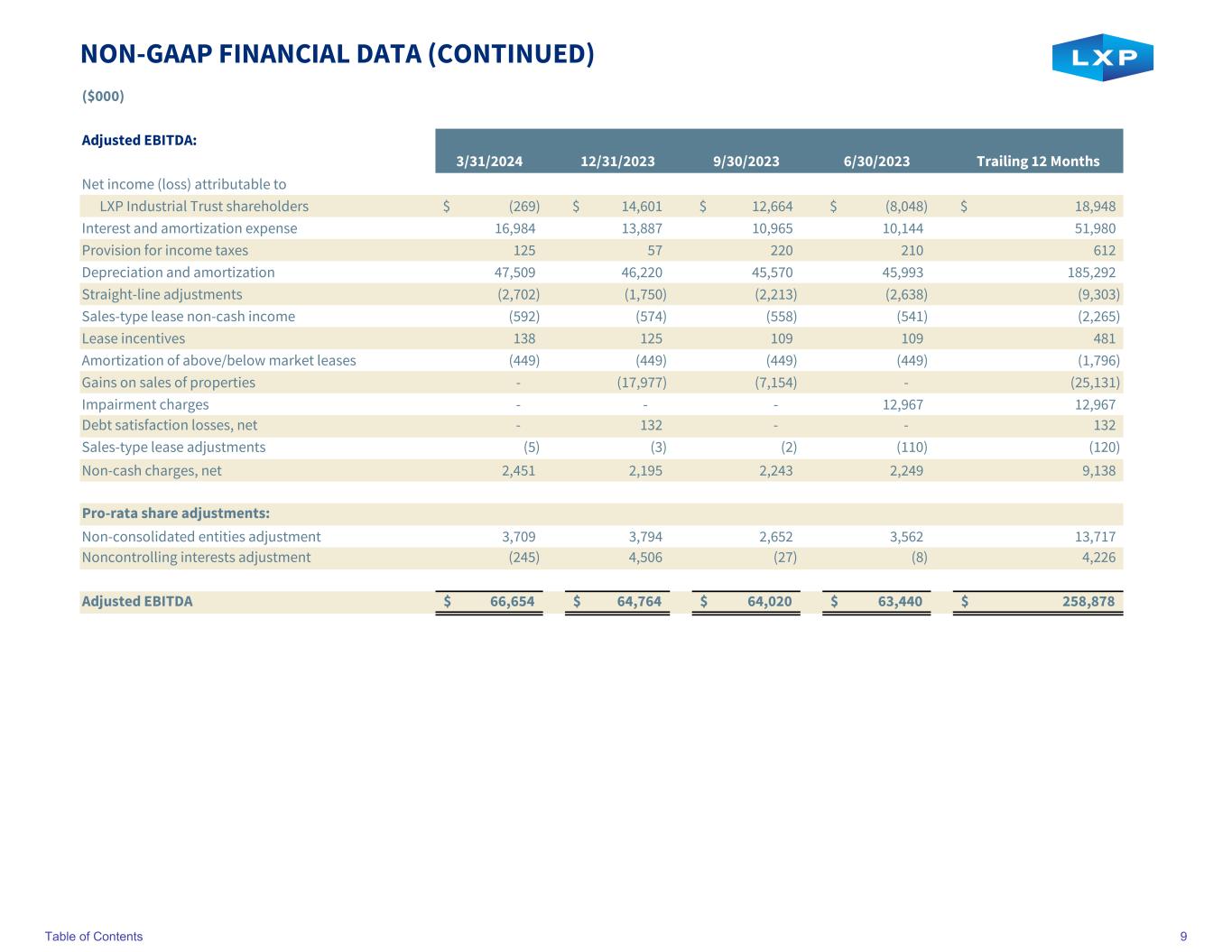 NON-GAAP财务数据(续)(000美元)调整后EBITDA:3/31/202412/31/20239/30/20236/30/2023过去12个月归属于LXP Industrial Trust股东的净利润(亏损)(269)$ 14,601 $ 12,664 $(8,048)$ 18,948 $利息和摊销费用16,98413,88710,96510,14451,980所得税准备金12557220210612折旧及摊销47,50946,22045,57045,993185,292直线调整(2,702)(1,750)(2,213)(2,638)(9,303)销售型租赁非现金收入(592)(574)(558)(541)(2,265)租赁奖励138125109109481高于/低于市场租赁摊销(449)(449)(449)(449)(1,796)出售物业收益-(17,977)(7,154)-(25,131)减值费用---12,96712,967债务清偿损失,净额-132--132销售型租赁调整(5)(3)(2)(110)(120)非现金费用,净额2,4512,1952,2432,2499,138按比例份额调整:非合并实体调整3,7093,7942,6523,56213,717非控股权益调整(245)4,506(27)(8)4,226调整后EBITDA 66,654美元64,764美元64,020美元63,440美元258,878美元目录9