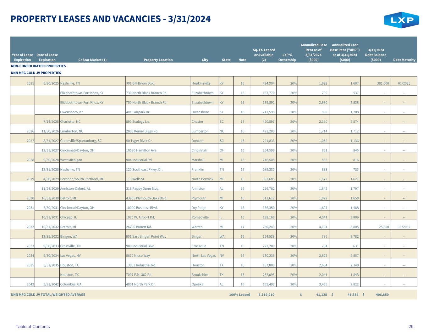 物业租赁及空缺-3/31/2024租约年份到期日租约到期CoStar Market(1)物业位置City State Note Sq。英尺。已出租或可用(2)截至2024年3月31日的LXP %所有权年化基础租金(000美元)截至2024年3月31日的年化现金基础租金(“ABR”)(000美元)2024年3月31日的债务余额(000美元)债务到期非合并财产丨NNN 丨MFGTERM2 COLD JV Properties 20256/30/2025 Nashville,TN 301 Bill Bryan Blvd. Hopkinsville KY 16424,90420% 1,6981,687381,0001/2025 Elizabeth Town-Fort Knox,KY 730 North Black Branch Rd. Elizabeth Town KY 16167,77020%KY 4010 Airpark Dr. Owensboro KY 16211,59820% 9901,208---7/14/2025 Charlotte,NC 590 Ecology Ln。切斯特SC 16420,59720% 2,1902,574---202611/30/2026 Lumberton,NC 2880 Kenny Biggs Rd. Lumberton NC 16423,28020% 1,7141,712---20278/31/2027 Greenville/Spartanburg,SC 50 Tyger River Dr. Duncan SC 16221,83320% 1,0621,136---12/31/2027 Cincinnati/Dayton,OH 10590 Hamilton Ave. Cincinnati OH 16264,59820% 861845---20289/30/2028 West Michigan 904 Industrial Rd. Marshall MI 16246,50820% 835816---12/31/2028 Nashville,TN 120 Southeast富兰克林博士TN 16289,33020% 833735---20294/30/2029 Portland/South Portland,ME 113 Wells St. North Berwick ME 16993,68520% 1,6721,627---11/24/2029 Anniston-Oxford,AL 318 Pappy Dunn Blvd. Anniston AL 16276,78220% 1,8421,797---2030 10/31/2030 Detroit,MI 43955 Plymouth Oaks Blvd. Plymouth MI 16311,61220% 1,8721,658---20316/30/2031 Cincinnati/Dayton,OH 10000 Business Blvd. Dry Ridge KY 16336,35020% 1,6071,488--MI 26700 Bunert Rd. Warren MI 17260,24320% 4,1943,80525,85011/203212/31/2032 Bingen,WA 901 East Bingen Point Way Bingen WA 16124,53920% 7362,782---20339/30/2033 Crossville,TN 900 Industrial Blvd. Crossville TN 16222,20020% 704631---20349/30/2034 Las Vegas,NV 5670 Nicco Way North Las Vegas NV 16180,23520% 2,8252,557---20353/31/2035 Houston,TX 13863 Industrial Rd. Houston TX 16187,80020% 2,6042,348-GA 4801 North Park Dr. Opelika AL 16 165,49320% 3,4652,822----NNNMFG COLD JV总计/加权平均100%租赁6,719,21041,125 $ 41,335 $ 406,850 $目录29