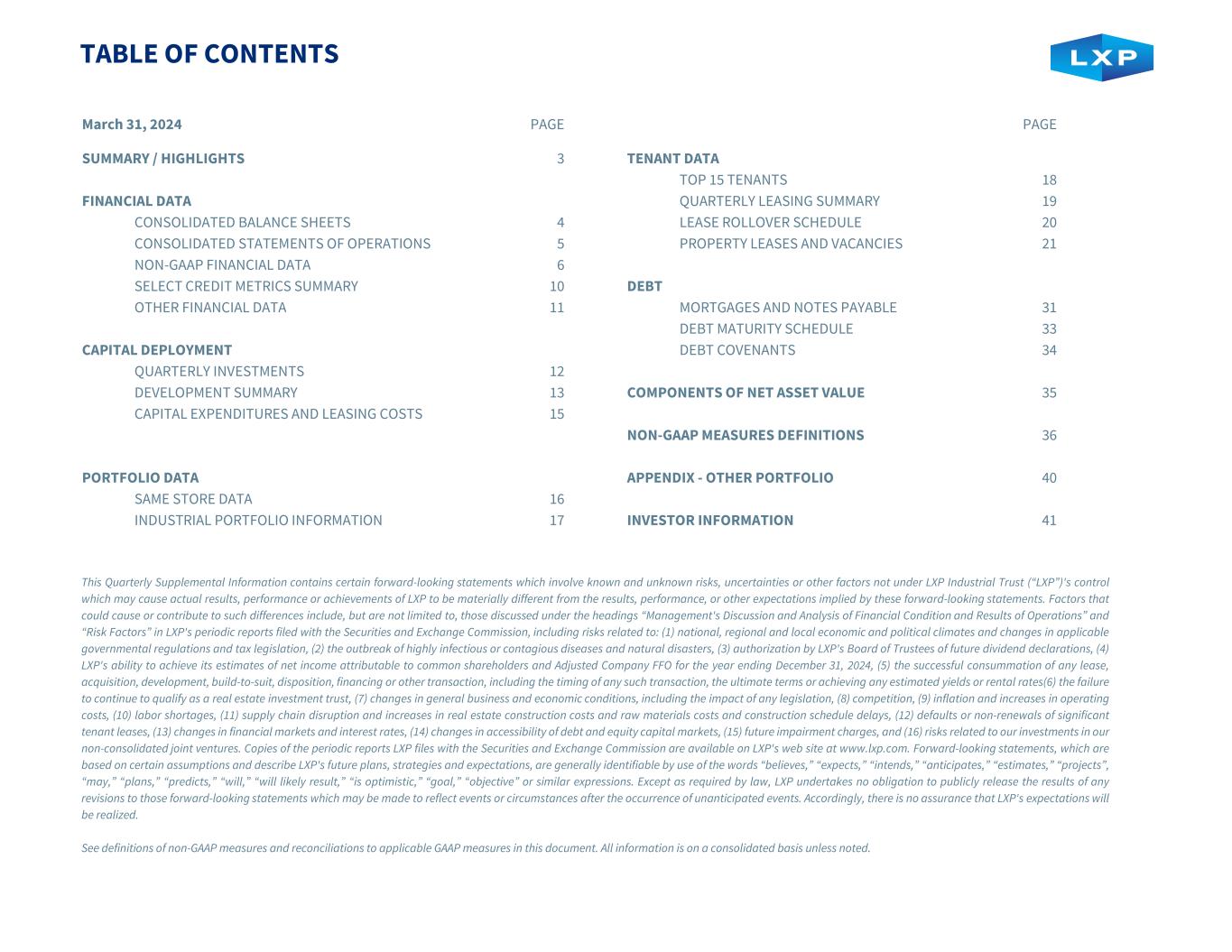 目录3月31日,2024页摘要/要点3租户数据TOP15租户18财务数据季度租赁摘要19合并资产负债表4租赁展期时间表20合并经营报表5物业租赁和空缺21非公认会计准则财务数据6选择信贷指标摘要10债务其他财务数据11抵押贷款和应付票据31债务到期时间表信息17投资者信息41本季度的补充信息包含某些前瞻性陈述,这些陈述涉及已知和未知的风险、不确定性或其他不在LXP Industrial Trust(“LXP”)控制下的因素,这些因素可能导致LXP的实际结果、业绩或成就与这些前瞻性陈述所暗示的结果、业绩或其他预期存在重大差异。可能导致或促成此类差异的因素包括但不限于LXP向美国证券交易委员会提交的定期报告中“管理层对财务状况和经营成果的讨论和分析”和“风险因素”标题下讨论的因素,包括与以下相关的风险:(1)国家、地区和地方的经济和政治气候以及适用的政府法规和税法的变化,(2)爆发高度传染性或传染性疾病和自然灾害,(3)LXP董事会对未来股息宣布的授权,(4)LXP实现其对截至2024年12月31日止年度归属于普通股股东的净利润和调整后公司FFO估计的能力,(5)任何租赁、收购、开发、定制、处置、融资或其他交易的成功完成,包括任何此类交易的时间、最终条款或实现任何估计收益率或出租率(6)未能继续符合房地产投资信托的资格,(7)一般商业和经济状况的变化,包括任何立法的影响,(8)竞争,(9)通货膨胀和运营成本增加,(10)劳动力短缺,(11)供应链中断和房地产建设成本和原材料成本增加以及施工进度延迟,(12)重大租户租约违约或不续签,(13)金融市场和利率的变化,(14)债务和股权资本市场准入的变化,(15)未来减值费用,以及(16)与我们对非合并合资企业的投资相关的风险。美国证券交易委员会(Securities and Exchange Commission)的定期报告LXP文件副本可在LXP的网站www.lxp.com上查阅。前瞻性陈述基于某些假设,描述了LXP的未来计划、战略和预期,通常可以通过使用“相信”、“预期”、“打算”、“预期”、“估计”、“项目”、“可能”、“计划”、“预测”、“将”、“将可能导致”、“乐观”、“目标”或类似表达方式来识别。除法律要求外,LXP不承担公开发布可能为反映意外事件发生后的事件或情况而对这些前瞻性陈述进行的任何修订的结果的义务。因此,无法保证LXP的预期一定会实现。请参阅本文件中非GAAP措施的定义以及与适用的GAAP措施的对账。除非另有说明,所有信息均为综合信息。