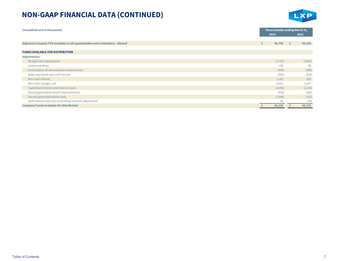 NON-GAAP财务数据(未经审计,以千为单位,股票和每股数据除外)20242023运营资金:基本和稀释后:归属于普通股股东的净收入(亏损)(1,931)$ 9,522 $调整:折旧和摊销-房地产46,20844,860减值费用-房地产-3,523非控股权益-运营单位-3租赁佣金摊销1,301881合资企业和非控股权益调整1,5632,400出售物业的收益,包括我们在非合并实体中的份额-(12,654)可供普通股股东和单位持有人使用的FFO-基本47,14148,535优先股股息1,5721,572分配给参与证券的金额9072可供普通股股东和单位持有人使用的FFO-稀释后的48,80350,179信用损失准备金(5)79交易成本(1)-4非控制性权益调整-(4)可供所有权益持有人和单位持有人使用的调整后公司FFO-稀释后48,798美元每股普通股50,258美元和单位金额:基本:FFO 0.16 $ 0.17 $稀释后:FFO 0.16 $ 0.17 $调整后公司FFO 0.16 $ 0.17 $加权平均普通股:基本:加权平均已发行普通股-基本每股收益291,288,383290,080,508运营合伙单位(2)-832,087加权平均已发行普通股-基本FFO 291,288,383290,912,595稀释后:加权平均已发行普通股-稀释后每股收益291,288,383291,040,466优先股-C系列4,710,5704,710,570加权平均已发行普通股-稀释后FFO 295,998,953295,751,036(1)包括与签订销售型租赁相关的成本。(2)包括我们持有的OP单位以外的OP单位。截至3月31日的三个月,目录6