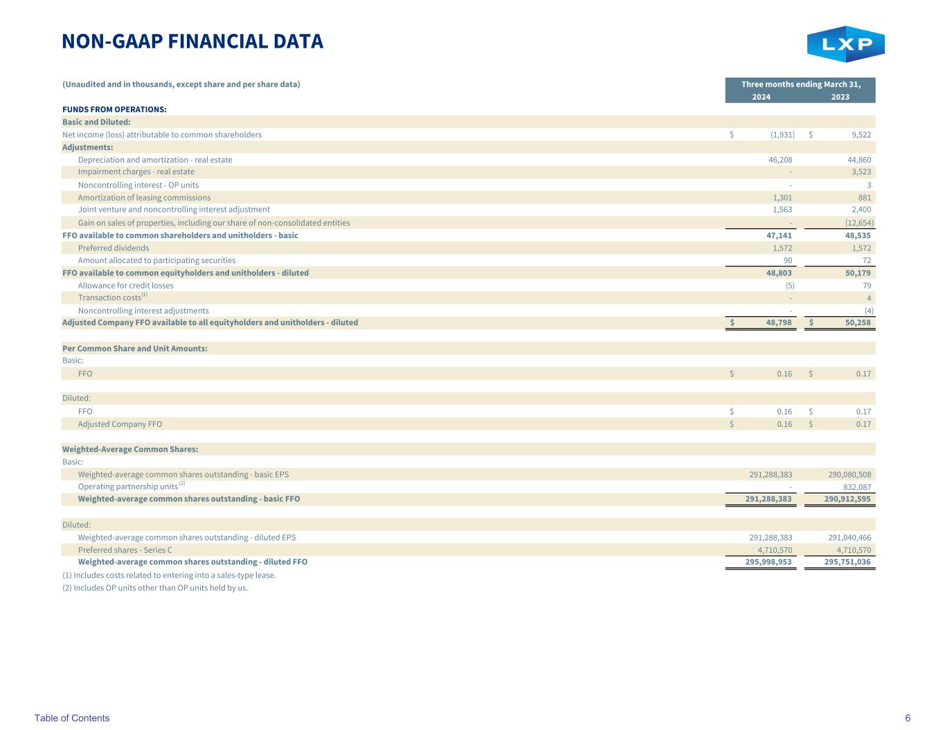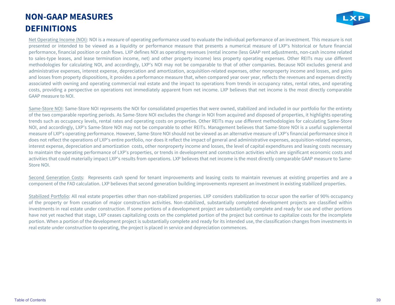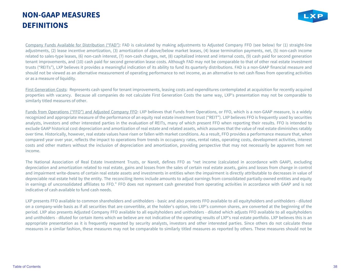 非公认会计准则计量公司可用于分配的资金(“FAD”)的定义:FAD的计算方法是对调整后的公司FFO(见下文)进行调整,用于(1)直线调整,(2)租赁奖励摊销,(3)高于/低于市场租赁的摊销,(4)租赁终止付款净额,(5)与销售类租赁相关的非现金收入,(6)非现金利息,(7)非现金费用净额,(8)资本化利息和内部成本,(9)为第二代租户改进支付的现金,以及(10)为第二代租赁费用支付的现金。尽管FAD可能无法与其他房地产投资信托基金(“REITs”)相提并论,但LXP认为,FAD提供了一个有意义的指标,表明其为季度分配提供资金的能力。FAD是一种非GAAP财务指标,不应被视为替代净收入的经营业绩衡量标准、替代经营活动产生的净现金流量或流动性衡量标准。第一代成本:指用于租户改善的现金支出、租赁成本和最近收购的空置物业在收购时预期的支出。因为并非所有公司都以相同的方式计算第一代成本,所以LXP的演示文稿可能无法与其他类似标题的衡量标准进行比较。运营资金(“FFO”)和调整后公司FFO:LXP认为,运营资金(FFO)是一种非公认会计准则衡量标准,是广泛认可且适当的衡量权益型房地产投资信托基金(“REIT”)业绩的指标。LXP认为,证券分析师、投资者和其他感兴趣的各方在评估REITs时经常使用FFO,其中许多在报告结果时会提出FFO。FFO旨在排除GAAP历史成本折旧和房地产及相关资产的摊销,后者假设房地产的价值随着时间的推移而相应减少。然而,从历史上看,房地产价值随市场状况而上升或下降。因此,FFO提供了一种绩效衡量标准,在逐年比较时,它反映了出租率、租金、运营成本、开发活动、利息成本和其他事项的趋势对运营的影响,而不包括折旧和摊销,提供了可能不一定从净收入中明显可见的视角。美国全国房地产投资信托协会(National Association of Real Estate Investment Trusts,简称Nareit)将FFO定义为“净收入(按照公认会计原则计算),不包括与房地产相关的折旧和摊销、出售某些房地产资产的损益、控制权变更的损益以及某些房地产资产和实体投资的减值减记,当减值直接归因于实体持有的可折旧房地产价值下降时。调节项目包括将合并部分拥有实体的收益和未合并关联公司收益中的权益调整为FFO的金额。”FFO不代表根据公认会计原则从经营活动中产生的现金,也不表示可用于满足现金需求的现金。LXP呈现出可供普通股股东和单位持有人使用的FFO-基本的,也呈现出可供所有权益持有人和单位持有人使用的FFO-在全公司范围内稀释,就好像所有可由持有人选择转换为LXP普通股的证券在期初都已转换一样。LXP还提供了适用于所有权益持有人和单位持有人的调整后公司FFO-稀释后即调整了适用于所有权益持有人和单位持有人的FFO-稀释后的某些项目,我们认为这些项目不代表LXP房地产投资组合的经营业绩。由于证券分析师、投资者和其他相关方经常提出要求,LXP认为这是一个适当的演示文稿。由于其他人没有以类似方式计算这些措施,这些措施可能无法与其他人报告的类似标题的措施进行比较。这些措施不应是目录38