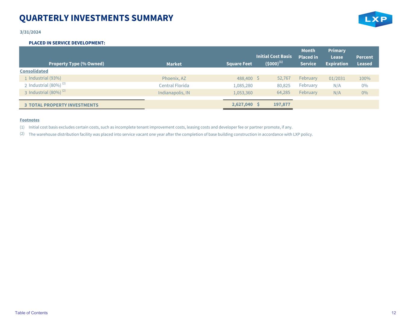 投放于服务开发的季度投资摘要:物业类型(拥有百分比)平方英尺初始成本基础(000美元)(1)投放于服务的月份初级租赁到期百分比租赁综合1工业(93%)488,400美元52,767 2月1日/2031年100% 2工业(80%)(2)1,085,28080,8252月不适用0% 3工业(80%)(2)1,053,36064,2852月不适用0% 32,627,040美元197,877脚注(1)初始成本基础不包括某些成本,例如不完整的租户改善成本、租赁成本和开发商费用或合作伙伴推广(如果有)。(2)该仓配设施在基地建筑建设完成一年后按照LXP政策空置投入使用。3/31/2024市场总财产投资印第安纳波利斯,在佛罗里达州中部凤凰城,亚利桑那州目录12