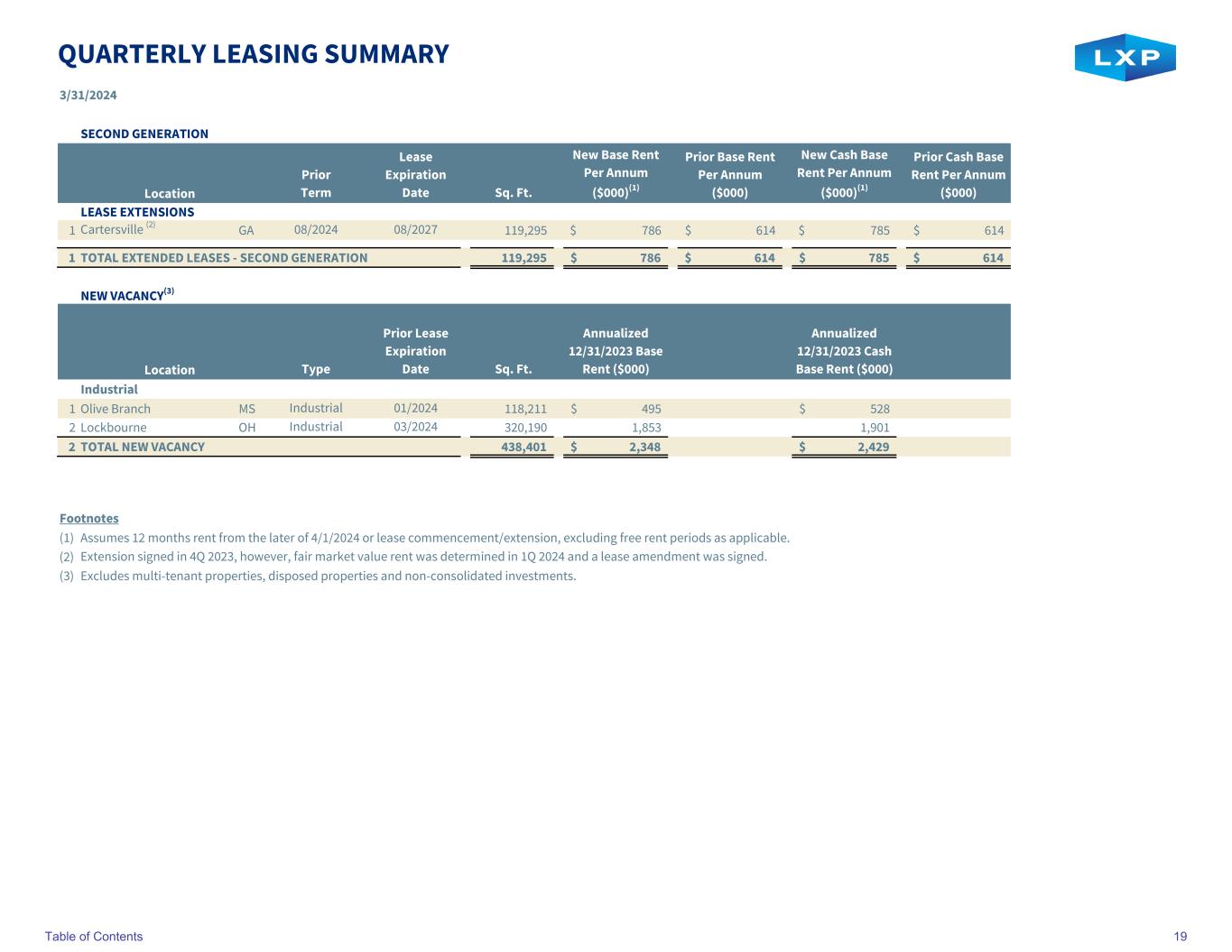季度租赁摘要第二代上一期租赁到期日 SQ。英尺。每年新的基本租金(000美元)(1)每年先前的基本租金(000美元)每年新的现金基础租金(000美元)(1)每年先前的现金基础租金(000美元)租赁延期1 Cartersville(2)GA 08/202408/2027119,295786 $ 614 $ 785 $ 614 $ 1延长租赁总额-第二代119,295786 $ 614 $ 785 $ 614 $新空缺(3)类型先前租赁到期日 Sq。英尺。年化12/31/2023基本租金(000美元)年化12/31/2023现金基础租金(000美元)Industrial 1 Olive Branch MS Industrial 0 1/2024118,211495 $ 528 $ 2 Lockbourne OH Industrial 03/2024320,1901,8531,9012总新空缺438,4012,348 $ 2,429 $ footnotes(1)假设自2024年4月1日或租约开始/延期(以较晚者为准)起的12个月租金,不包括适用的免费租期。(2)2023年第四季度签署的延期,但2024年第一季度确定了公平市场价值租金并签署了租约修正案。(3)不包括多租户物业、处置物业和非合并投资。地点3/31/2024地点目录19