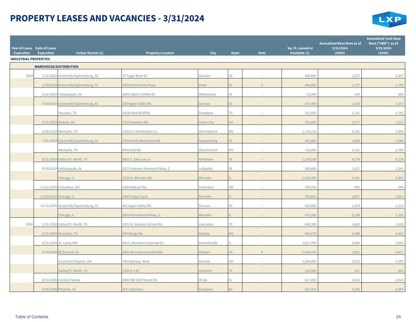 物业租赁及空缺-3/31/2024租约年份到期日租约到期CoStar Market(1)物业位置City State Note Sq。英尺。租赁或可用(2)截至2024年3月31日的年化基础租金(000美元)截至2024年3月31日的年化现金基础租金(“ABR”)(000美元)工业物业仓库/分配20291/31/2029 Greenville/Spartanburg,SC 70 Tyger River Dr. Duncan SC--408,0002,5272,4072/28/2029 Greenville/Spartanburg,SC 140 Smith Farms PKWY。Greer SC 3304,8841,7571,7993/31/2029 Indianapolis,in 4600 Albert S White Dr. Whitestown in--53,2403393064/30/2029 Greenville/Spartanburg,SC 230 Apple Valley Rd. Duncan SC--275,4001,4201,377 Houston,TX 10535 Red Bluff Rd. Pasadena TX--257,8351,7411,7955/31/2029 Atlanta,GA 7225 Goodson Rd. Union City GA--370,0002,5771,5216/30/2029 Memphis,TN 11624 S. Distribution CV。Olive Branch MS--1,170,2184,1013,9597/31/2029 Greenville/Spartanburg,SC 5795 North Blackstock Rd. Spartanburg SC--341,6601,6881,688 Memphis,TN 8500 Nail Rd. Olive Branch MS--716,0802,7512,7868/31/2029 Dallas/ft. Worth,TX 8601 E. 李灿森 Ln。Northlake TX--1,214,5264,2784,2149/30/2029印第安纳波利斯,1627 Veterans Memorial PKWY。E. Lafayette IN--309,4001,4271,241 Chicago,IL 6225 E. Minooka Rd. Minooka IL--1,034,2002,9312,89211/21/2029 Columbus,OH 1860 Walcutt Rd. Columbus OH--194,79698394911/30/2029 Chicago,IL 1460 Cargo Court Minooka IL--705,6612,8572,81412/31/2029 Greenville/Spartanburg,SC 402 Apple Valley Rd. Duncan SC--235,6001,2631,213 Chicago,IL 200 International PKWY。S. Minooka IL--473,2802,1382,10520301/31/2030 Dallas/FT. Worth,TX 3201 N. Houston School Rd. Lancaster TX--468,300 1,6691,6303/31/2030 Memphis,TN 549 Wingo Rd. Byhalia MS--855,8784,3884,5415/31/2030 St. Louis,MO 4015 Lakeview Corporate Dr. Edwardsville IL--1,017,7803,4603,0546/30/2030 Richmond,VA 2601 Bermuda Hundred Rd. Chester VA 41,034,4703,8514,071 Cincinnati/Dayton,OH 700 Gateway BlTX 1704 S. I-45 Hutchins TX--120,9606176018/31/2030 Central Florida 3400 NW 35th Street Rd. Ocala FL--617,0553,0142,9149/30/2030 Phoenix,AZ 255 143rd Ave. Goodyear AZ--801,4244,1934,097目录24