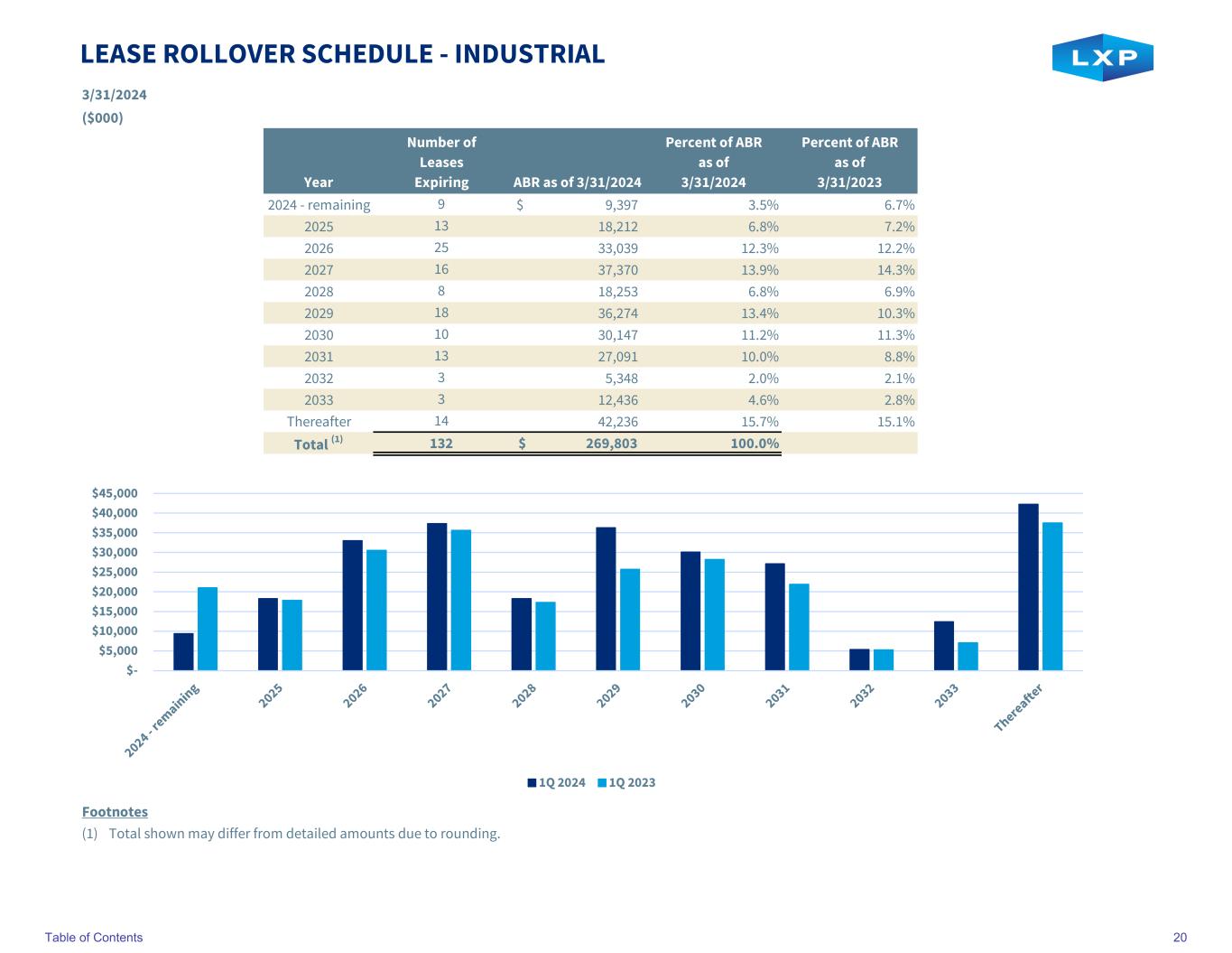 租赁展期时间表-工业(000美元)截至2024年3月31日ABR到期的租赁年数截至2024年3月31日ABR的百分比ABR的百分比截至2023年3月31日2024-剩余99,397 $ 3.5% 6.7% 20251318,2126.8% 7.2% 20262533,03912.3% 12.2% 20271637,37013.9% 14.3% 2028818,2536.8% 6.9% 20291836,27413.4% 10.3% 20301030,14711.2% 11.3% 20311327,09110.0% 8.8% 203235,3482.0% 2.1% 2033312,4364.6% 2.8%此后1442,23615.7% 15.1%合计(1)132269,803 $ 100.0%脚注(1)由于四舍五入,所示总额可能与详细金额不同。3/31/2024 $-$ 5,000 $ 10,000 $ 15,000 $ 20,000 $ 25,000 $ 30,000 $ 35,000 $ 40,000 $ 45,000 2024年第一季度2023年第一季度目录20