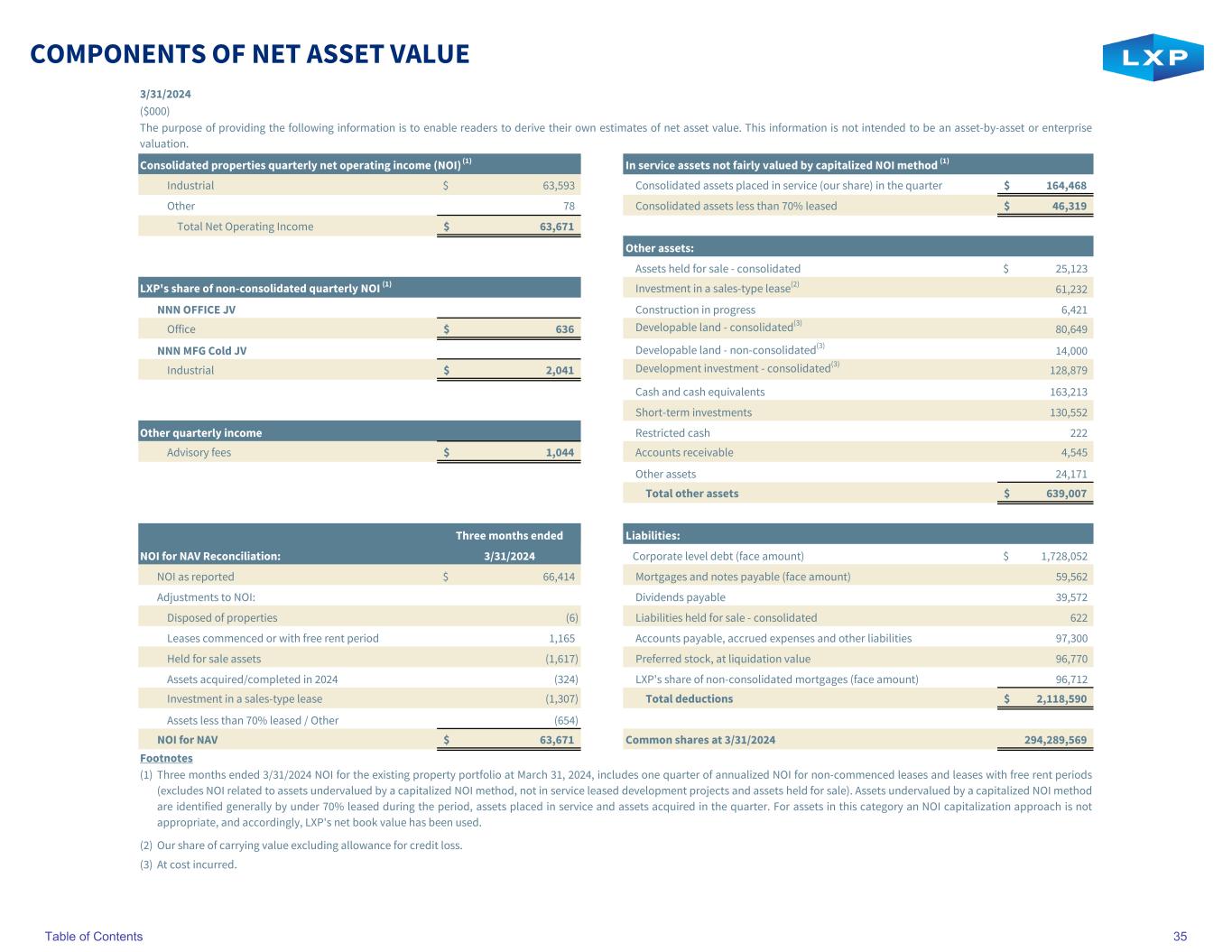 资产净值构成部分(000美元)合并物业季度净营业收入(NOI)(1)未按资本化NOI法公允估值的服务资产(1)工业63,593美元本季度投入使用的合并资产(我们的份额)164,468美元其他78项低于70%的合并资产租赁46,319美元净营业收入总额63,671美元其他资产:持有资产出售-合并后25,123美元LXP在非合并季度NOI中的份额(1)对销售型租赁的投资(2)61,232 NNN办公室合资公司在建工程6,421办公室636美元可开发土地-合并(3)80,649 NNNMFG Cold JV可开发土地-非合并(3)14,000工业2,041美元开发投资-合并(3)128,879现金及现金等价物163,213短期投资130,552其他季度收入受限制现金222咨询费1,044美元应收账款4,545其他资产24,171其他资产总额639,007美元截至三个月的负债:NAV调节的NOI:3/31/2024公司层面的债务(面值金额)1,728,052美元报告的NOI 66,444及应付票据(面值)59,562调整NOI:应付股息39,572处置物业(6)持有待售负债-合并622租赁开始或有免租期1,165应付账款、应计费用和其他负债97,300持有待售资产(1,617)优先股,按清算价值计算2024年获得/完成的资产(324)LXP在非合并抵押贷款中的份额(面值)96,712投资于销售型租赁(1,307)扣除总额2,118,590美元资产低于70%的租赁/其他(654)NOI为NAV 63,671美元于2024年3月31日的普通股294,289,569脚注(1)(2)我们在不包括信用损失准备金的账面价值中的份额。(3)按发生的成本计。3/31/2024提供以下信息的目的是使读者能够得出自己对资产净值的估计。这些信息并非旨在逐个资产或企业估值。截至2024年3月31日止三个月现有物业组合的NOI,包括未开始租赁和有免费租期的租赁的四分之一年化NOI(不包括与按资本化NOI法被低估的资产相关的NOI,而不包括服务租赁开发项目和持有待售资产)。以资本化NOI法被低估的资产通常通过期间租赁低于70%、投入使用的资产和本季度收购的资产来识别。对于此类资产,NOI资本化方法不合适,因此使用了LXP的账面净值。目录35