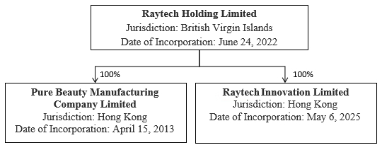 Raytech Holding是一家在英属维尔京群岛(“BVI”)注册成立的控股公司。作为一家控股公司,瑞泰控股本身并无重大经营活动,其经营活动由其全资附属公司Pure Beauty Manufacturing Company Limited(“Pure Beauty”)进行,该公司总部位于中华人民共和国(“中国”)特别行政区香港。2025年5月6日,雷泰控股成立了另一家全资子公司Raytech Innovation Limited(“Raytech Innovation”),该公司也在香港注册成立;截至本招股说明书之日,Raytech Innovation尚未开始运营,也没有资产。此次发行的是在英属维尔京群岛注册成立的控股公司Raytech Holding的普通股,而不是其在香港的运营实体Pure Beauty或Raytech Innovation的股份。您可能永远不会直接持有Raytech Holding运营实体的任何股权。
