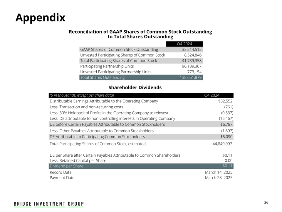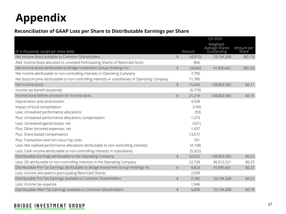 附录GAAP每股亏损与2024年第四季度每股可分配收益的对账加权-平均每股金额(千美元,每股数据除外)金额流通股普通股股东可获得的净收入(亏损)$(4,912)33,194,308 $(0.15)加:分配给限制性股票未归属参与股票的收益(亏损)866归属于Bridge Investment Group Holdings Inc.的净收入(亏损)$(4,046)41,890,461 $(0.10)归属于运营公司非控股权益的净利润7,700归属于运营公司子公司非控股权益的净(亏损)收入11,786净收入(亏损)15,440138,802,982 $ 0.11所得税收益(费用)(5,779)所得税拨备前收入(亏损)21,219138,802,982 $ 0.15折旧及摊销4,928资金合并影响(194)减:未实现业绩分配(93)加:未实现业绩分配报酬1,273减:未实现(收益)损失,净额(421)加:其他(收入)费用,净额1,437加:股份补偿13,072加:交易和非经常性成本761减:归属于非控股权益的已实现业绩分配净额(4,108)减:归属于子公司非控股权益的现金收入(5,322)归属于运营公司的可分配收益32,552美元138,802,982美元0.23减:归属于运营公司非控股权益的DE 22,72896,912,521美元0.23美元归属于Bridge Investment Group Holdings Inc.的可分配税前收益9,82441,890,461美元0.23减:分配给参与限制性股票的收益2,039可供普通股股东分配的税前收益7,78533,194,308美元0.23减:所得税费用1,946可供普通股股东分配的税后收益5,83933,194,308美元0.18美元27