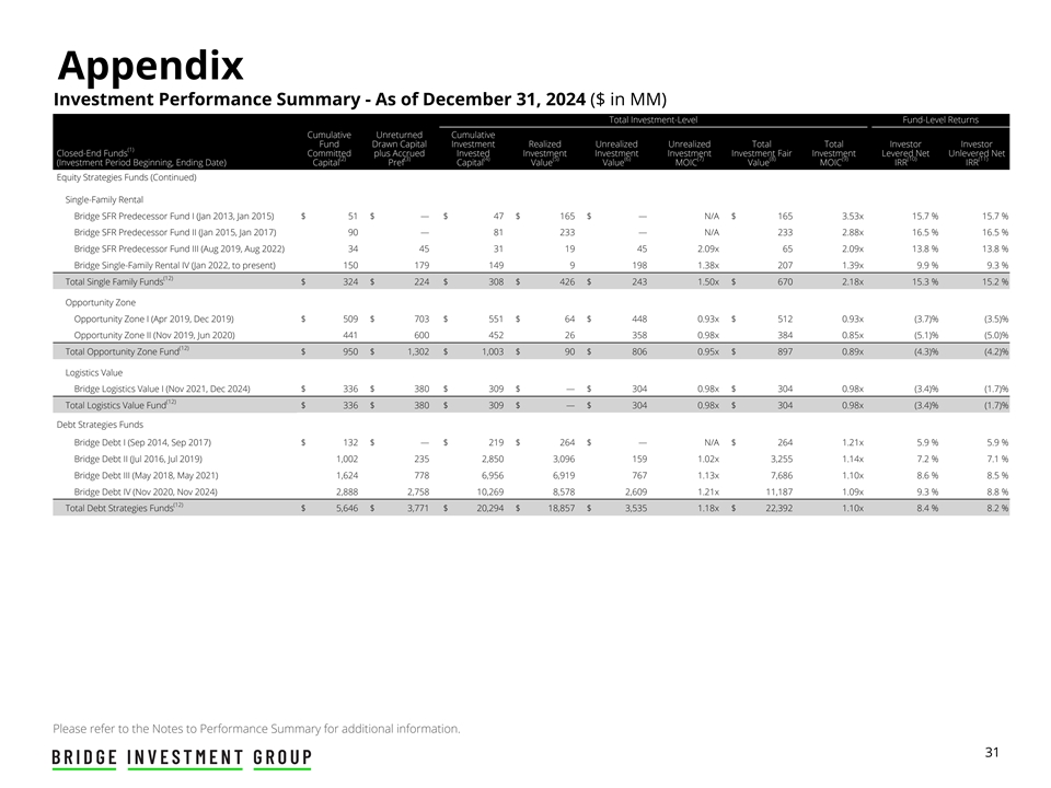 附录投资业绩摘要-截至2024年12月31日(百万美元)投资级基金层面总回报累计未归还累计基金提取资本投资已实现未实现投资者总投资者(1)封闭式承诺资金加上应计投资投资投资投资投资公平投资杠杆净无杠杆净额(2)(3)(4)(5)(6)(7)(8)(9)(10)(11)(投资期开始、结束日期)资本优先资本价值MOIC价值MOIC IRR IRR股票策略基金(续)单户租赁桥SFR前身基金I(2013年1月,2015年1月)$ 51 $ — $ 47 $ 165 $ — N/A $ 165 3.53x15.7 % 15.7% Bridge SFR Predecessor Fund II(2015年1月、2017年1月)90 — 81233 — N/A233 2.88x16.5 % 16.5% Bridge SFR Predecessor Fund III(2019年8月、2022年8月)3445311945 2.09x65 2.09x13.8 % 13.8% Bridge Single-Family Rental IV(2022年1月,至今)15017914991981.38x2071.39x9.9 % 9.3%(12)单一家庭资金总额$ 324 $ 224 $ 308 $ 426 $ 2431.50x $ 670 2.18x 15.3% 15.2% Opportunity Zone Opportunity Zone I(Apr 2019,Dec 2019)$ 509 $ 703 $ 551 $ 64 $ 448 0.93x $ 512 0.93x(3.7)%(3.5)% Opportunity Zone II(Nov 2019,2020年6月)44160045226358 0.98x 384 0.85x(5.1)%(5.0)%(12)Total Opportunity Zone Fund $ 950 $ 1,302 $ 1,003 $ 90 $ 806 0.95x $ 897 0.89x(4.3)%(4.2)% Logistics Value Bridge Logistics Value I(Nov 2021,Dec 2024)$ 336 $ 380 $ 309 $ — $ 304 0.98x $ 304 0.98x(3.4)%(1.7)%(12)Total Logistics Value Fund $ 336 $ 380 $ 309 $ — $ 304 0.98x $ 304 0.98x(3.4)%(1.7)% Debt Strategies Funds Bridge Debt I(Sep 2014,2017年9月)$ 132 $ — $ 219 $ 264 $ — N/A $ 264 1.21x5.9 % 5.9% Bridge Debt II(2016年7月、2019年7月)1,0022352,8503,0961591.02x3,2551.14x7.2 % 7.1% Bridge Debt III(2018年5月、2021年5月)1,6247786,9566,919767 1.13x7,6861.10x8.6 % 8.5% Bridge Debt IV(2020年11月,2024年11月)2,8882,75810,2698,5782,609 1.21x 11,1871.09x 9.3% 8.8%(12)债务策略基金总额$ 5,646 $ 3,771 $ 20,294 $ 18,857 $ 3,5351.18x $ 22,392 1.10x 8.4% 8.2%详情请参阅业绩摘要附注。31