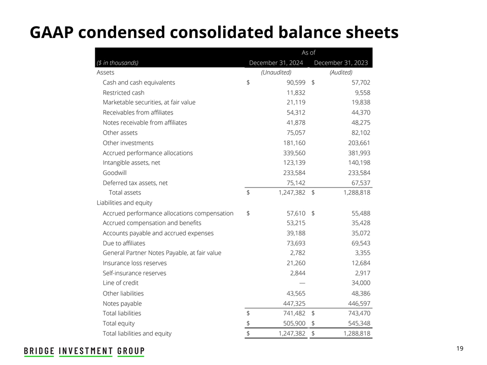 GAAP简明合并资产负债表截至(千美元)2024年12月31日2023年12月31日资产(未经审计)(经审计)现金和现金等价物90,599美元57,702美元受限制现金11,8329,558有价证券,按公允价值计算21,11919,838应收关联公司款项54,31244,370应收关联公司票据41,87848,275其他资产75,05782,102其他投资181,160203,661应计业绩分配款339,560381,993 无形资产,净值净额123,139140,198商誉233,584233,584递延所得税资产,净资产75,14267,537总资产1,247,382美元1,288,818美元负债和权益应计业绩分配薪酬57,610美元55,488美元应计薪酬和福利53,21535,428应付账款和应计费用39,18835,072应付关联公司款项73,69369,543按公允价值计算的普通合伙人应付票据2,7823,355保险损失准备金21,26012,684自保准备金2,8442,917信用额度— 34,000其他负债43,56548,386应付票据447,325446,597总负债$ 741,482 $ 743,470总权益$ 505,900 $ 545,348 总负债及权益 $ 1,247,382 $ 1,288,81819