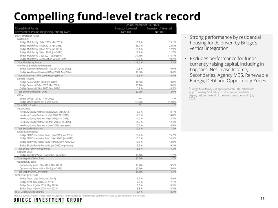 截至2024年12月31日,令人信服的基金层面业绩记录封闭式基金投资者杠杆投资者无杠杆(投资期开始、结束日期)净IRR净IRR股票策略基金•住宅多户桥梁多户I表现强劲(2009年3月、2013年3月)15.1% 15.1%住房基金受Bridge’s Bridge Multifamily II推动(2012年4月、2015年4月)23.0% 22.5% Bridge Multifamily III(2015年1月、2018年1月)18.4% 17.9%垂直整合。Bridge Multifamily IV(2018年6月、2021年6月)11.9% 11.7% 1 Bridge Multifamily V(2021年7月至今)(17.1)%(15.7)% Bridge Multifamily Continuation Vehicle(N/A)18.2% 18.2% •不包括基金业绩多户基金总额13.6% 13.3%目前筹集的资本,包括在劳动力和经济适用住房方面Bridge Workforce Housing I(2017年8月、2020年8月)10.8% 10.9%物流、净租赁收入、Bridge Workforce Housing II(2020年8月、2024年8月)(0.6)%(0.4)% Total Workforce & Affordable Housing Funds 5.5% 5.5% Secondaries,Agency MBS,可再生老年人住房能源、债务和机会区。Bridge Seniors I(2014年1月、2018年1月)(4.0)%(3.8)% Bridge Seniors II(2017年3月、2020年3月)(0.7)%(0.6)% 1 Bridge Seniors III(2020年11月、2024年11月)6.4% 6.3% Bridge Multifamily V约68%被调用,总的老年人住房资金(2.2)%(2.0)%约7亿美元的干粉可用于在7月Bridge Office I(2017年7月、2020年7月)投资期结束前部署******2025.桥梁办公Ⅱ(2019年12月、2022年12月)(15.3)%(12.8)%办公资金合计******Secondaries Newbury Equity Partners I(2006年9月、2013年3月)8.2% 8.1% Newbury Equity Partners II(2009年10月、2015年10月)14.8% 14.8% Newbury Equity Partners III(2013年7月、2019年3月)14.0% 12.3% Newbury Equity Partners IV(2017年5月、2023年2月)14.5% 12.4% Newbury Equity Partners V(2019年11月至今)10.6% 8.9% Secondaries Funds总额12.1% 11.3% Single-Family Rental Bridge SFR Predecessor Fund I(2013年1月,2015年1月)15.7% 15.7% Bridge SFR Predecessor Fund II(2015年1月、2017年1月)16.5% 16.5% Bridge SFR Predecessor Fund III(2019年8月、2022年8月)13.8% 13.8% Bridge Single-family Rental IV(2022年1月至今)9.9% 9.3% Total Single-family Rental Funds 15.3% 15.2% Logistics Value Bridge Logistics Value I(Nov 2021,Dec 2024)(3.4)%(1.7)% Total Logistics Value Fund(3.4)%(1.7)% Opportunity Zone Opportunity Zone I(Apr 2019,Dec 2019)(3.7)%(3.5)% Opportunity Zone II(Nov 2019,2020年6月)(5.1)%(5.0)%总机会区基金(4.3)%(4.2)%债务策略基金过桥债务I(2014年9月、2017年9月)5.9% 5.9%过桥债务II(2016年7月、2019年7月)7.2% 7.1%过桥债务III(2018年5月、2021年5月)8.6% 8.5%过桥债务IV(2020年11月、2024年11月)9.3% 8.8%总债务策略基金8.4% 8.2%仅为摘要。有关更多信息,请参阅附录,了解幻灯片32上的性能摘要说明。13