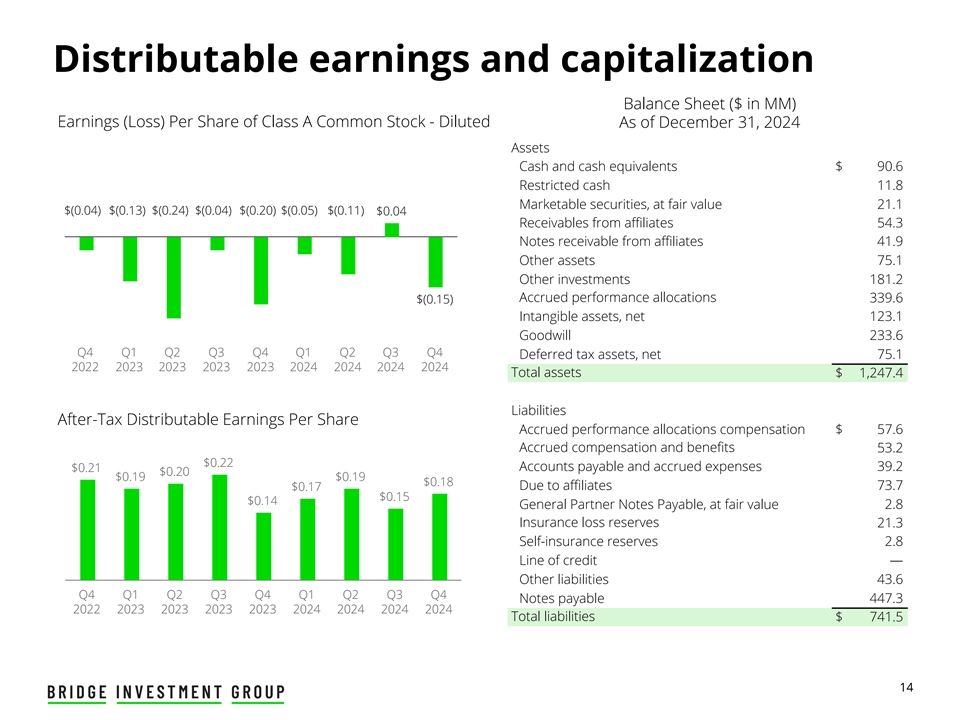 可分配收益和资本化资产负债表(百万美元)A类普通股每股收益(亏损)-截至2024年12月31日稀释资产现金和现金等价物$ 90.6受限制现金11.8有价证券,按公允价值计算21.1 $(0.04)$(0.13)$(0.24)$(0.04)$(0.20)$(0.05)$(0.11)$ 0.04应收关联公司款项54.3应收关联公司票据41.9其他资产75.1其他投资181.2应计业绩分配339.6 $(0.15)无形资产,净值净额123.1商誉233.6 Q4 Q1 Q2 Q3 Q4 Q1 Q2 Q3 Q4递延所得税资产,净额75.1 202220232023202320232023202420242024总资产1,247.4美元负债税后可分配每股收益应计业绩分配薪酬57.6美元应计薪酬和福利53.2美元0.22美元应付账款和应计费用39.2美元0.21美元0.20美元0.19美元0.19美元0.18美元0.17美元应付关联公司款项73.7美元0.15美元0.14美元普通合伙人应付票据,按公允价值计算2.8保险损失准备金21.3自保准备金2.8信用额度—其他负债43.6 Q4 Q1 Q2 Q3 Q4 Q4应付票据447.3 2022202320232023202320232023202420242024负债总额741.5美元14