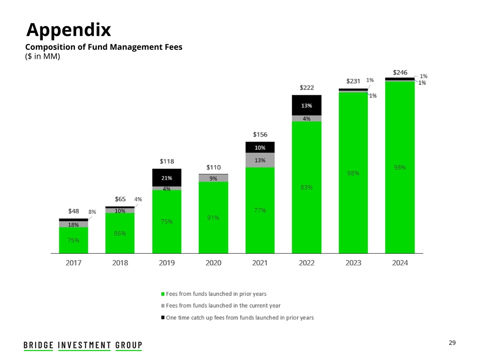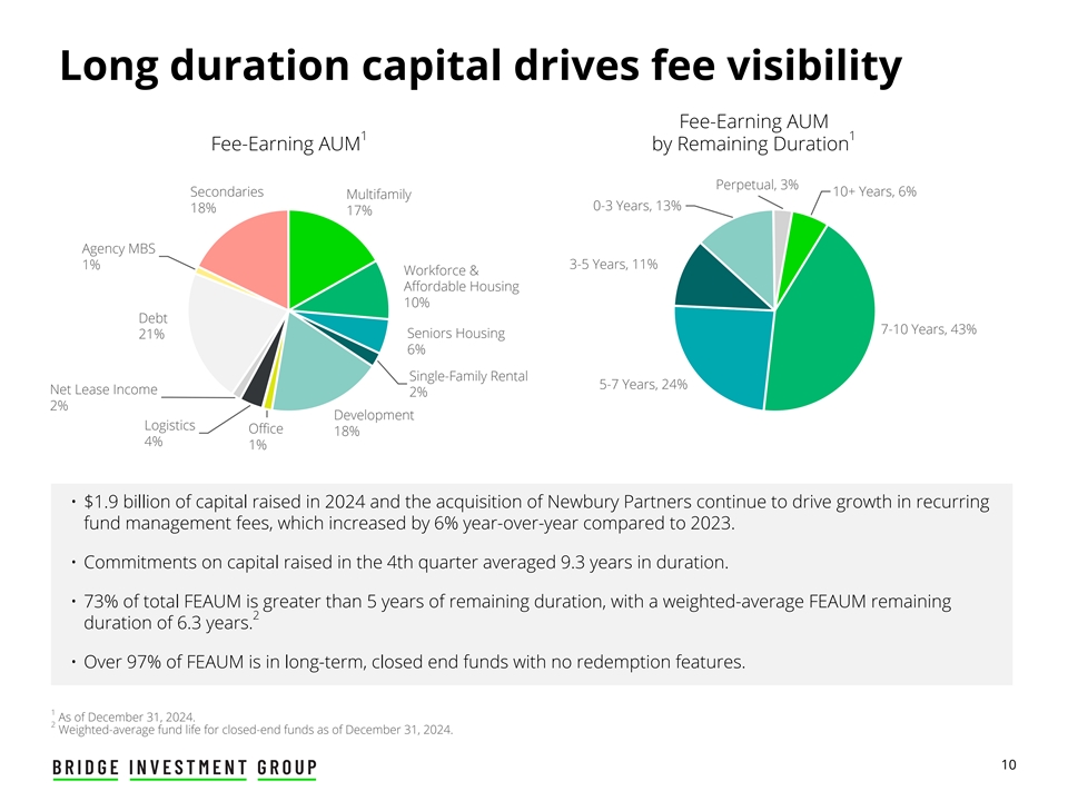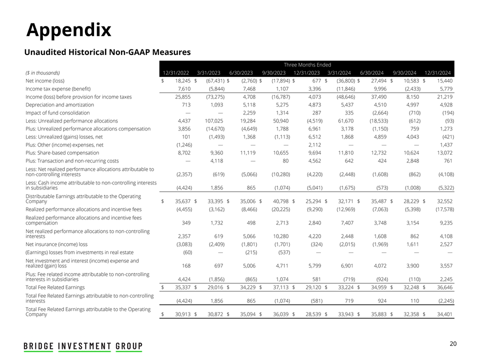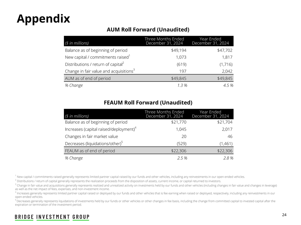 免责声明此处包含的信息不构成也不构成,也不应被解释为认购、承销或以其他方式收购Bridge Investment Group Holdings Inc.(“Bridge”或“公司”)、Bridge Investment Group Holdings LLC(“运营公司”)或Bridge的任何关联公司的任何证券的要约或邀请,或Bridge或Bridge的关联公司管理的任何基金或其他投资工具的一部分。本演示不应构成购买或认购Bridge的任何证券或由Bridge或Bridge的关联公司管理的任何基金或其他投资工具的任何合同的基础,或与任何其他合同或承诺相关的任何合同或承诺相关的任何合同的依据或与此相关的依赖。本演示文稿不构成经修订的1933年《证券法》含义内的“招股说明书”。购买Bridge或其任何关联公司证券的任何决定应完全基于Bridge将就特定发售发布的招股说明书中包含的信息。前瞻性陈述本演示文稿包含前瞻性陈述。本演示文稿中包含的历史事实陈述以外的所有陈述都可能是前瞻性陈述。关于我们未来经营业绩和财务状况、业务战略以及管理层未来经营的计划和目标的陈述,包括(其中包括)关于预期增长、筹资、与财务和非财务措施相关的预期或目标、未来资本支出、基金业绩和偿债义务的陈述,均为前瞻性陈述。在某些情况下,您可以通过“可能”、“将”、“应该”、“预期”、“计划”、“寻求”、“预期”、“计划”、“预测”、“展望”、“可能”、“打算”、“目标”、“项目”、“考虑”、“相信”、“估计”、“预测”、“潜在”或“继续”或这些术语的否定或其他类似表述。因此,我们提醒您,任何此类前瞻性陈述都不是对未来业绩的保证,并受到难以预测且超出我们控制能力的风险、假设和不确定性的影响。尽管我们认为,截至作出之日,这些前瞻性陈述中反映的预期是合理的,但实际结果可能证明与前瞻性陈述明示或暗示的结果存在重大差异。如果与这些前瞻性陈述或其他风险或不确定性相关的一个或多个事件成为现实,或者如果我们的基本假设被证明是不正确的,实际结果可能与我们的预期存在重大差异。决定这些结果的许多重要因素超出了我们的控制或预测能力。我们认为,这些因素包括但不限于我们于2024年3月7日向美国证券交易委员会(“SEC”)提交的截至2023年12月31日止年度的10-K表格年度报告中题为“风险因素”一节中描述的风险因素,该报告可在SEC网站www.sec.gov上查阅。这些因素不应被解释为详尽无遗,应与本报告和我们其他文件中包含的其他警示性声明一起阅读。您不应过分依赖任何此类前瞻性陈述。任何前瞻性陈述仅在作出之日起生效,除法律另有规定外,我们不承担任何义务公开更新或审查任何前瞻性陈述,无论是由于新信息、未来发展或其他原因。新的因素不时出现,我们无法预测哪些会出现。我们无法评估每个因素对我们业务的影响,也无法评估任何因素或因素组合在多大程度上可能导致实际结果与任何前瞻性陈述中包含的结果存在重大差异。行业信息除非另有说明,本演示文稿中包含的有关我们的行业、竞争地位和我们经营所在市场的信息均基于来自独立行业和研究组织、其他第三方来源和管理层估计的信息。管理层的估计来自独立行业分析师和其他第三方来源发布的公开信息,以及我们内部研究的数据,并基于我们在审查这些数据时做出的假设,以及我们在这些行业和市场的经验和知识,我们认为这些是合理的。此外,对我们经营所在行业的未来业绩和我们未来业绩的预测、假设和估计,由于多种因素,必然会受到不确定性和风险的影响, 这可能导致结果与独立方和我们所做估计中表达的结果存在重大差异。非GAAP财务指标本演示文稿使用了未按照美国公认会计原则(“GAAP”)列报的财务指标,例如可分配收益、与费用相关的收益、与费用相关的收入和与业绩相关的收益,以补充根据GAAP列报的财务信息。本演示文稿中介绍的非GAAP财务指标的使用存在局限性。例如,非GAAP财务指标可能无法与其他公司类似标题的指标进行比较。其他公司计算非GAAP财务指标的方式可能与公司不同,从而限制了这些指标用于比较目的的有用性。在整个列报过程中,所有当期金额均为初步金额,未经审计。2