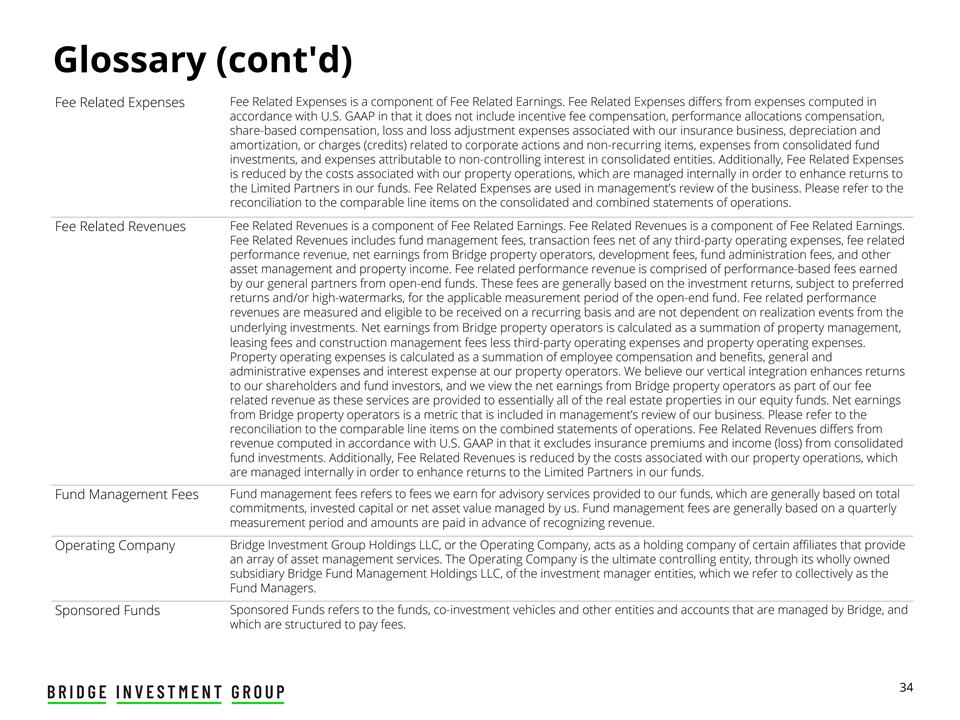 词汇表(续)费用相关费用费用相关费用是费用相关收益的组成部分。费用相关费用与根据美国公认会计原则计算的费用不同,它不包括奖励费补偿、业绩分配补偿、股份补偿、与我们的保险业务相关的损失和损失调整费用、折旧和摊销,或与公司行动和非经常性项目相关的费用(贷项)、来自合并基金投资的费用以及归属于合并实体的非控股权益的费用。此外,与费用相关的费用因与我们的物业运营相关的成本而减少,这些成本由内部管理,以提高我们基金中有限合伙人的回报。费用相关费用用于管理层对业务的审查。请参阅与合并和合并经营报表可比项目的对账。费用相关收入费用相关收入是费用相关收益的组成部分。与费用相关的收入是与费用相关的收益的组成部分。与费用相关的收入包括基金管理费、扣除任何第三方运营费用的交易费、与费用相关的业绩收入、来自桥梁物业运营商的净收益、开发费、基金管理费以及其他资产管理和物业收入。与费用相关的业绩收入由我们的普通合伙人从开放式基金赚取的基于业绩的费用组成。这些费用一般以投资收益为基础,以优选收益和/或高水位线为准,适用于开放式基金的计量期。与费用相关的业绩收入是计量的,有资格在经常性基础上收到,不依赖于基础投资的实现事件。来自桥梁物业运营商的净收益按物业管理、租赁费和建设管理费减去第三方运营费用和物业运营费用的总和计算。物业运营费用是在我们的物业运营商计算的员工薪酬和福利、一般和行政费用以及利息费用的总和。我们认为,我们的垂直整合提高了对股东和基金投资者的回报,我们将来自Bridge物业运营商的净收益视为我们与费用相关的收入的一部分,因为这些服务基本上提供给我们股权基金中的所有房地产物业。Bridge物业运营商的净收益是一个指标,包含在管理层对我们业务的审查中。请参阅与合并经营报表上可比项目的对账。与费用相关的收入与根据美国公认会计原则计算的收入不同,它不包括保险费和合并基金投资的收入(损失)。此外,与我们的物业运营相关的成本减少了与费用相关的收入,这些成本由内部管理,以提高我们基金中有限合伙人的回报。基金管理费基金管理费是指我们为旗下基金提供顾问服务所赚取的费用,一般以我们管理的总承诺、投入资本或资产净值为基础。基金管理费一般以季度计量期为基础,在确认收入前提前支付金额。Bridge Investment Group Holdings LLC或运营公司作为某些关联公司的控股公司,为运营公司提供一系列资产管理服务。运营公司是投资管理实体的最终控制实体,通过其全资子公司Bridge Fund Management Holdings LLC,我们将其统称为基金管理人。发起式基金发起式基金是指由Bridge管理的基金、跟投工具及其他实体和账户,其结构是为了支付费用。34