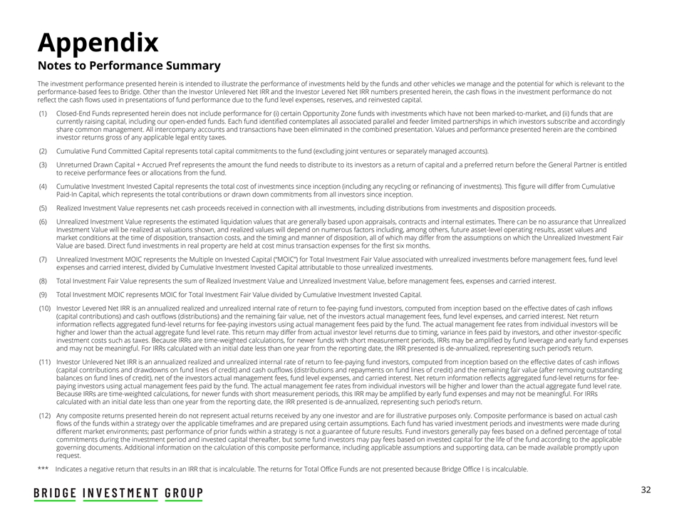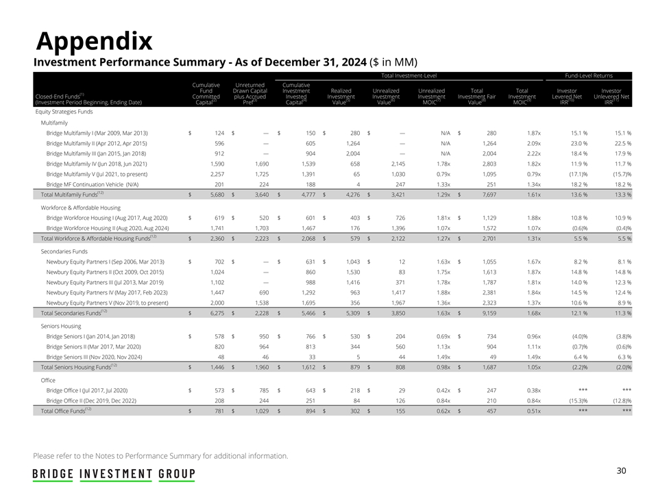 附录投资业绩摘要-截至2024年12月31日(百万美元)投资级基金层面总回报累计未归还累计基金提取资本投资已实现未实现总投资者(1)封闭式基金承诺加应计投资投资投资投资投资公平投资杠杆净无杠杆净额(2)(3)(4)(5)(6)(7)(8)(9)(10)(11)(投资期开始、结束日期)资本优先资本价值MOIC价值MOIC IRR IRR股票策略基金多户桥梁多户I(2009年3月,2013年3月)$ 124 $ — $ 150 $ 280 $ — N/A $ 2801.87x 15.1% 15.1% Bridge Multifamily II(Apr 2012,Apr 2015)596 — 6051,264 — N/A 1,264 2.09x 23.0% 22.5% Bridge Multifamily III(Jan 2015,Jan 2018)912 — 9042,004 — N/A 2,004 2.22x 18.4% 17.9% Bridge Multifamily IV(Jun 2018,Jun 2021)1,5901,6901,5396582,145 1.78x 2,803 1.82x 11.9% Bridge Multifamily V(Jul 2021,至今)2,2571,7251,391651,030 0.79x 1,0950.79x(17.1)%(15.7)% Bridge MF Continuation Vehicle(N/A)20122418842471.33x 2511.34x 18.2% 18.2%(12)Total Multifamily Funds $ 5,680 $ 3,640 $ 4,777 $ 4,276 $ 3,4211.29x $ 7,697 1.61x 13.6% 13.3% Workforce & Affordable Housing Bridge Workforce Housing I(Aug 2017,Aug 2020)$ 619 $ 520 $ 601 $ 403 $ 726 1.81x $ 1,1291.88x 10.8% 10.9% Bridge Workforce Housing II(Aug 2020,2024年8月)1,7411,7031,4671761,3961.07x 1,572 1.07x(0.6)%(0.4)%(12)总劳动力和经济适用住房基金$ 2,360 $ 2,223 $ 2,068 $ 579 $ 2,122 1.27x $ 2,701 1.31x 5.5% 5.5% Secondaries Funds Newbury Equity Partners I(Sep 2006,Mar 2013)$ 702 $ — $ 631 $ 1,043 $ 12 1.63x $ 1,055 1.67x 8.2% 8.1% Newbury Equity Partners II(Oct 2009,Oct 2015)1,024 — 8601,530831.75x 1,613 1.87x 14.8% 14.8% Newbury Equity Partners III(Jul 2013,2019年3月)1,102 — 9881,4163711.78x1,7871.81x14.0 % 12.3% Newbury Equity Partners IV(2017年5月、2023年2月)1,4476901,2929631,4171.88x2,3811.84x14.5 % 12.4% Newbury Equity Partners V(2019年11月至今)2,0001,5381,6953561,9671.36x2,3231.37x10.6 % 8.9%(12)Secondaries Funds total $ 6,275 $ 2,228 $ 5,466 $ 5,309 $ 3,8501.63x $ 9,1591.68x12.1 % 11.3% Seniors Housing Bridge Seniors I(2014年1月,2018年1月)$ 578 $ 950 $ 766 $ 530 $ 2040.69x $ 734 0.96x(4.0)%(3.8)% Bridge Seniors II(Mar 2017,Mar 2020)820964813344560 1.13x 904 1.11x(0.7)%(0.6)% Bridge Seniors III(Nov 2020,Nov 2024)484633544 1.49x 49 1.49x 6.4% 6%(12)Total Seniors Housing Funds $ 1,446 $ 1,960 $ 1,612 $ 879 $ 8080.98x $ 1,6871.05x(2.2)%(2.0)% Office Bridge Office I(Jul 2017,2020年7月)573美元785美元643美元218美元29美元0.42x 247美元0.38x******Bridge Office II(2019年12月、2022年12月)20824425184126 0.84x 210 0.84x(15.3)%(12.8)%(12)办公室资金总额$ 781 $ 1,029 $ 894 $ 302 $ 155 0.62x $ 457 0.51x******有关更多信息,请参阅业绩摘要附注。30