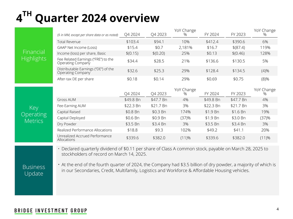 TH 4 Quarter 2024 Overview YoY Change YoY Change($ in MM,except per share data or as noted)Q4 2024 Q4 2023% FY 2024 FY 2023%% Total revenue $ 103.4 $ 94.1 10% $ 412.4 $ 390.66% GAAP Net income(loss)$ 15.4 $ 0.72,181% $ 16.7 $(87.4)119% financial income(loss)per share,基本$(0.15)$(0.20)25% $ 0.13 $(0.46)128%突出费用相关收益(“FRE”)至$ 34.4 $ 28.521% $ 136.6 $ 130.55%运营公司可分配收益(“DE”)为$ 32.6 $ 25.329% $ 128.4 $ 134.5(4)%运营公司税后每股DE $ 0.18 $ 0.14 29% $ 0.69 $ 0.75(8)% YoY change YoY change Q4 2024 Q4 2023%% FY 2024 FY 2023%% Gross AUM $ 498亿$ 477亿$ 477亿$ 4% $ 498亿$ 477亿$ 4% Fee-earning AUM $ 223亿$ 217亿$ 3% $ 223亿$ 217亿$ 3% Key Capital raised $ 0.8 bn $ 3 bn 174% $ 19 bn09亿美元(37)% 19亿美元30亿美元(37)% Metrics Dry Powder 35亿美元34亿美元3% 35亿美元34亿美元3%已实现业绩分配18.8美元9.3102% 49.2美元41.1美元20%未实现应计业绩339.6美元382.0(11)% 339.6美元382.0(11)%分配•宣布季度股息为每股A类普通股0.11美元,于2025年3月28日支付给2025年3月14日登记在册的股东。•截至2024年第四季度末,公司拥有35亿美元的干粉,其中大部分是我们的二级市场、信贷、多户家庭、物流以及劳动力和经济适用房车的业务。更新4