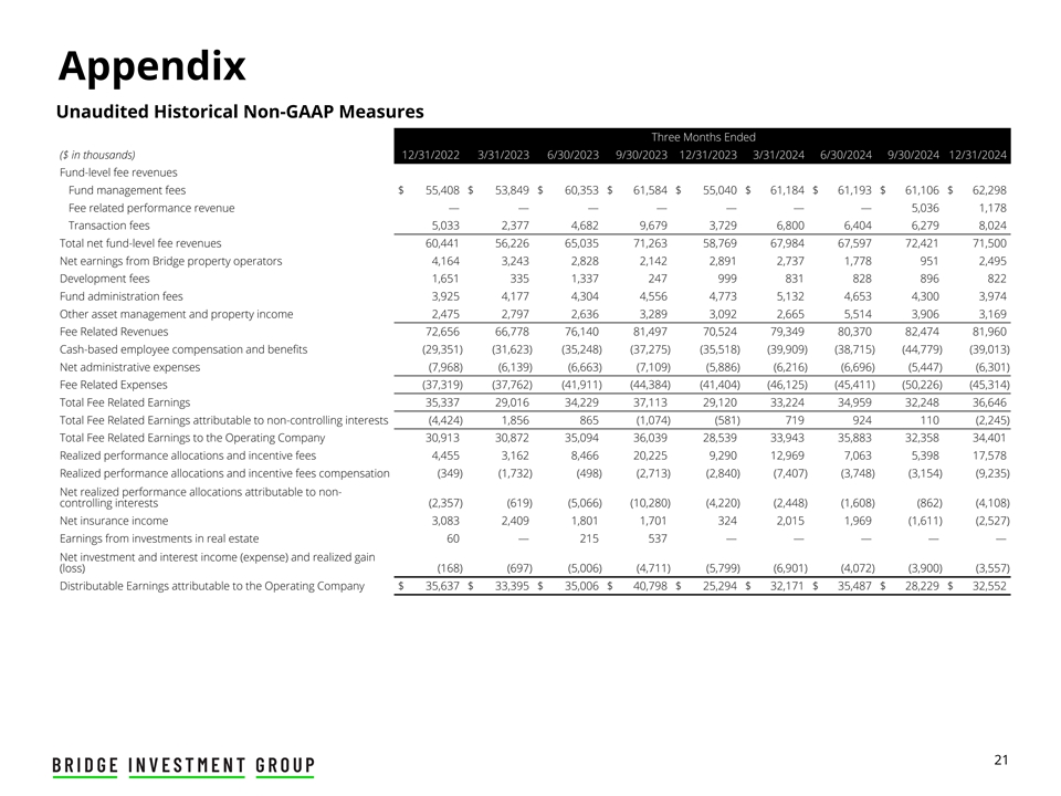 附录未经审计的历史非公认会计原则与公认会计原则的对账截至三个月(千美元)12/31/20223/31/20236/30/20239/30/202312/31/20233/31/20246/30/20249/30/202412/31/2024已实现业绩分配和奖励费4455美元3162美元8466美元20225美元9290美元12969美元7063美元5398美元17578美元费用相关业绩收入—————— 50361178奖励费——(41)————业绩分配,实现4,455美元3,162美元8,425美元20,225美元9,290美元12,969美元7,063美元10,434美元18,756美元基于现金的员工薪酬和福利29,351美元31,623美元35,248美元37,275美元35,518美元39,909美元38,715美元44,779美元39,013美元桥梁财产运营商的补偿费用9,43610,19510,00910,6279,54611,12111,23411,74310,288股份补偿8,7029,36011,11910,6559,69411,81012,73210,62413,072费用相关业绩收入补偿费用————————(3,011)(707)职工薪酬和福利47,489美元51,178美元56,376美元58,557美元54,758美元62,840美元62,681美元64,135美元61,666美元已实现业绩分配和奖励补偿349美元1,732美元498美元2,713美元2,840美元7,407美元3,748美元3,154美元9,235美元奖励费用补偿——(3)(1)————与费用相关的业绩收入补偿费用—————— 3,011707业绩分配补偿,已实现349美元1,732美元495美元2,712美元2,840美元7,407美元3,748美元6,165美元9,942管理费用,扣除桥梁物业营运商$ 7,968 $ 6,139 $ 6,663 $ 7,109 $ 5,886 $ 6,216 $ 6,696 $ 5,447 $ 6,301桥梁物业营运商的行政开支3,1403,6363,9764,3043,9243,7383,0903,4773,656交易及非经常费用— 4,118 — 804,5626424242,850762资金合并的影响—— 2,233649926753(813)56811一般管理费用11,108美元13,893美元12,872美元12,142美元15,298美元11,349美元9,397美元12,342美元10,730美元未实现收益(损失)$(101)$ 1,493美元(1,368)$ 1,113美元(6,512)$(1,868)$(4,859)$(4,043)$ 421净投资和利息收入(费用)和已实现收益(损失)(168)(697)(5,006)(4,711)(5,799)(6,901)(4,072)(3,900)(3,557)其他收入(费用),净额1,246 ————(2,112)————(1,437)资金合并的影响————(334)8675711,6661,390205归属于子公司非控股权益的非FRE收入———— 4,4612,3931,4971,1183,078其他费用合计$ 977 $ 796 $(6,374)$(3,932)$(9,095)$(5,805)$(5,768)$(5,435)$(1,290)归属于子公司非控股权益的现金收入$ 4,424 $(1,856)$(865)$ 1,074 $ 581 $(719)$(924)$(110)$ 2,103归属于子公司非控股权益的非现金收入(644)(434)((3,319)(3,370)(1,666)2,407归属于子公司非控股权益的非FRE收入—— 1,8454,4612,3931,4971,1183,078资金合并影响——(1,607)(792)(512)(582)866(533)—归属于非控股权益的已实现业绩分配2,3576195,06610,2804,2202,4481,6088624,250归属于非控股权益的未实现业绩分配(5,838)(54,578)(6,173)(31,991)(5,396)(42,142)14,14878(52)归属于Bridge Investment集团控股有限责任公司非控股权益的净收益(亏损)$ 299 $(56,249)$
