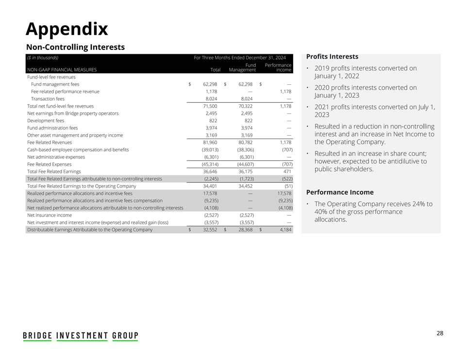 附录非控股权益利润利息(千美元)截至2024年12月31日止三个月基金业绩• 2019年按非公认会计准则财务计量折算的利润利息总管理收入2022年1月1日基金层面费用收入基金管理费62,298美元62,298美元—— • 2020年按费用相关业绩收入折算的利润利息1,178 — 1,1782023年1月1日8,0 248,0 24 —交易费基金层面费用净收入总额71,50070,3221,178 • 7月1日折算的2021年利润利息,来自桥梁物业运营商的净收益2,4952,495 — 2023开发费822822 — •导致非控股—基金管理费3,9743,974利息和净收入增加至其他资产管理和物业收入3,1693,169 —费用相关收入81,96080,7821,178运营公司。以现金为基础的雇员薪酬和福利(39,013)(38,306)(707)•导致股份数量增加;—净管理费用(6,301)(6,301)然而,预计将对费用相关费用(45,314)(44,607)(707)公众股东产生反稀释作用。费用相关收益总额36,64636,175471非控股权益应占费用相关收益总额(2,245)(1,723)(522)运营公司费用相关收益总额34,40134,452(51)绩效收入已实现的业绩分配和激励费用17,578 — 17,578已实现的业绩分配和激励费用补偿(9,235)—(9,235)•运营公司收到归属于非控股权益的已实现业绩分配净额的24%(4,108)—(4,108)毛业绩的40% —保险收入净额(2,527)(2,527)的分配。净投资和利息收入(费用)和已实现收益(亏损)(3,557)(3,557)—归属于运营公司的可分配收益$ 32,552 $ 28,368 $ 4,18428