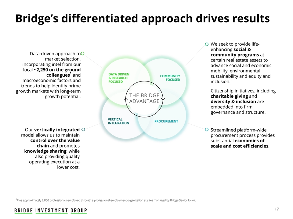 Bridge的差异化方法推动成果我们寻求在市场选择时为社区项目提供增强生活的社会和数据驱动方法、某些房地产资产以纳入来自我们先进的社会和经济本地~2250的英特尔地面流动性、环境1同事和可持续性以及公平和宏观经济因素和包容性。趋势以帮助确定主要的公民倡议,包括具有长期慈善捐赠和增长潜力的增长市场。多样性和包容性嵌入公司治理和结构中。我们垂直整合的精简全平台模式使我们能够保持采购流程提供对价值实质性经济的控制,并促进规模和成本效率。知识共享,同时还能以更低的成本提供高质量的运营执行。1加上通过专业就业组织在Bridge Senior Living管理的站点雇用的大约2800名专业人员。17