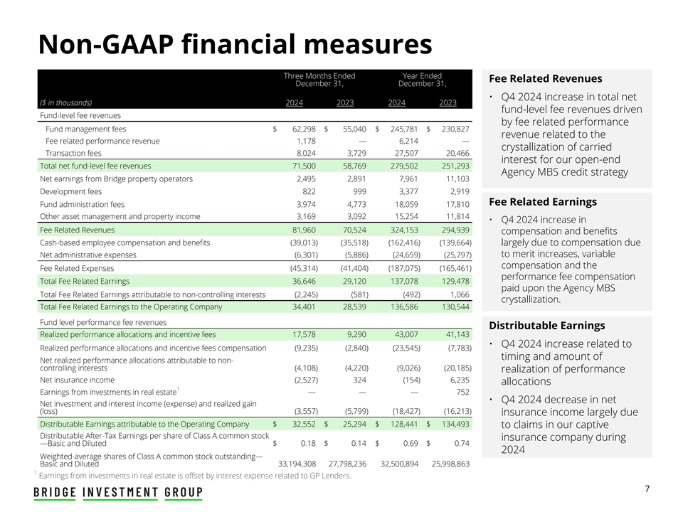 Non-GAAP财务指标三个月期末费用相关收入12月31日,12月31日,• 2024年第四季度净增加总额(千美元)2024202320242023基金一级费用收入推动基金一级费用收入与费用相关的业绩基金管理费62,298美元55,040美元245,781美元230,827美元与费用相关的业绩收入1,178 — 6,214 —附带交易费用的结晶8,0243,72927,50720,466利息对于我们的开放式总净基金层面费用收入71,50058,769279,502251,293机构MBS信贷策略来自桥梁物业运营商的净收益2,4952,8917,96111,103开发费8229993,3772,919与费用相关的收益基金管理费3,9744,77318,05917,810其他资产管理和财产收入3,1693,09215,25411,814 • 2024年第四季度与费用相关的收入增加81,96070,524324,153294,939薪酬和福利以现金为基础的员工薪酬和福利(39,013)(35,518)(162,416)(139,664)主要是由于绩效增加导致的薪酬,可变净管理费用(6,301)(5,886)(24,659)(25,797)补偿和费用相关费用(45,314)(41,404)(187,075)(165,461)绩效费补偿总费用相关收益36,64629,120137,078129,478支付给机构MBS总费用相关收益归属于非控股权益(2,245)(581)(492)1,066结晶。与运营公司相关的费用相关收益总额34,40128,539136,586130,544基金层面的绩效费收入可分配收益已实现的业绩分配和激励费用17,5789,29043,00741,143 • 2024年第四季度与已实现的业绩分配和激励费用补偿相关的增加(9,235)(2,840)(23,545)(7,783)归属于非控股权益的已实现业绩分配净额的时间和金额(4,108)(4,220)(9,026)(20,185)实现业绩净保险收入(2,527)324(154)6,235分配1房地产投资收益—— 752 • 2024年第四季度净投资和利息收入(费用)减少和已实现收益(亏损)(3,557)(5,799)(18,427)(16,213)保险收入主要是由于归属于运营公司的可分配收益32,552美元25,294美元128,441美元134,493美元对我们在A类普通股保险公司期间的专属可分配税后收益的索赔——基本和稀释后0.18美元0.14美元0.69美元0.74美元2024年A类普通股加权平均流通股——基本和稀释后33,194,30827,798,23632,500,89425,998,8631房地产投资的收益被与GP贷款人相关的利息费用所抵消。7