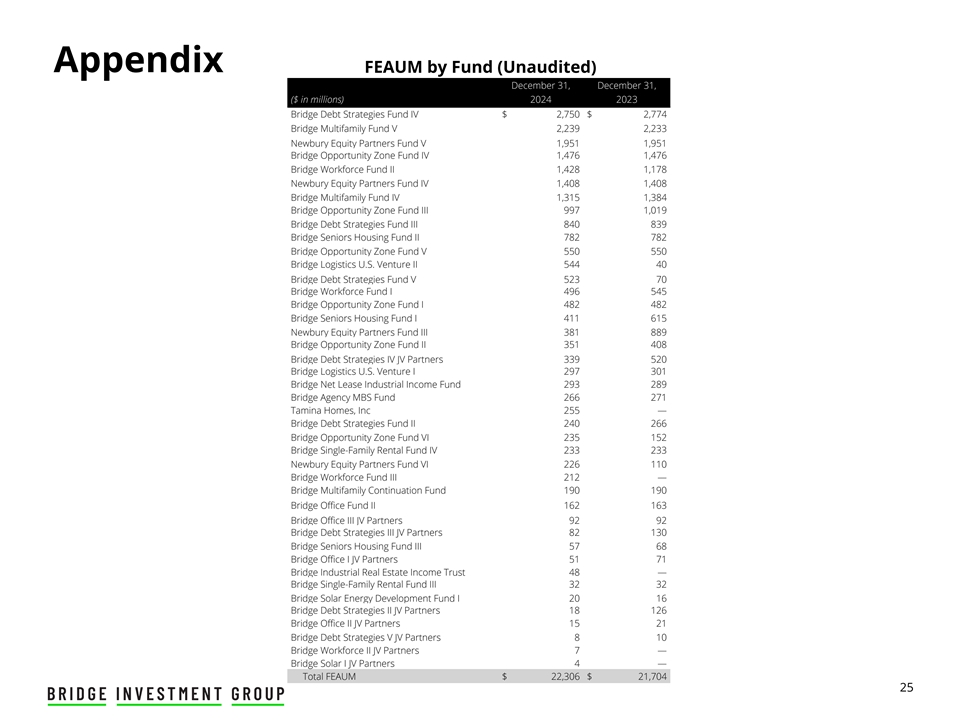 附录FEAUM按基金分类(未经审计)12月31日、12月31日,(百万美元)20242023 Bridge Debt Strategies Fund IV $ 2,750 $ 2,774 Bridge Multifamily Fund V 2,2392,233 Newbury Equity Partners Fund V 1,9511,951 Bridge Opportunity Zone Fund IV 1,4761,476 Bridge Workforce Fund II 1,4281,178 Newbury Equity Partners Fund IV 1,4081,408 Bridge Multifamily Fund IV 1,3151,384 Bridge Opportunity Zone Fund III 9971,019 Bridge Debt Strategies Fund III 840839 Bridge Seniors Housing Fund II 782782 Bridge Opportunity Zone Fund V 550550 Bridge Logistics U.S. Vent545 Bridge Opportunity Zone Fund I 482482 Bridge Seniors Housing Fund I 411615 Newbury Equity Partners Fund III 381889 Bridge Opportunity Zone Fund II 351408 Bridge Debt Strategies IV JV Partners 339520 Bridge Logistics U.S. Venture I 297301 Bridge Net Lease Industrial Income Fund 293289 Bridge Agency MBS Fund 266271 Tamina Homes,Inc 255 — Bridge Debt Strategies Fund II 240266 Bridge Opportunity Zone Fund VI 235152 Bridge Single-family Rental Fund IV 233233 Newbury Equity Partners Fund VI 226110 Bridge Workforce Fund III 212 — Bridge Multifamily Continuation Fund 190190 Bridge Office Fund II 162163 Bridge Office III JV Partners 9292 Bridge Debt Strategies III JV Partners 82130 Bridge Seniors Housing Fund III 5768 Bridge Office I JV Partners 5171 Bridge Industrial Real Estate Income Trust 48 — Bridge Single-family Rental Fund III 3232 Bridge Solar Energy Development Fund I 2016 Bridge Debt Strategies II JV Partners 18126 Bridge Office II JV Partners 1521 Bridge Debt Strategies V JV Partners 810 Bridge Workforce II JV Partners 7 — Bridge Solar I JV Partners 4 —总资金22,306美元21,70425