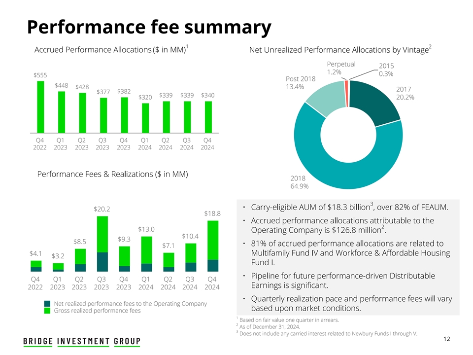 绩效费汇总12应计绩效分配(以mm为单位)按年份划分的未实现绩效分配净额Perpetual 2015 1.2% 0.3% $ 555post 2018 $ 448 $ 42813.4% 2017 $ 382 $ 377 $ 339 $ 339 $ 340 $ 32020.2% Q4 Q1 Q1 Q2 Q3 Q4 Q1 Q3 Q4 2022202220232023202320232024202420242024绩效费和实现(以mm为单位)2018 64.9% 3 •符合结转条件的AUM为183亿美元,超过FEAUM的82%。20.2美元18.8美元•归属于2美元13.0运营公司的应计业绩分配为1.268亿美元。10.4美元9.3美元8.5美元• 81%的应计绩效分配与7.1美元4.1美元的多户家庭基金IV和3.2美元的劳动力和经济适用住房基金I有关。•未来业绩驱动的可分配Q4 Q1 Q1 Q2 Q3 Q4 Q1 Q2 Q3 Q4 Q4收益显着。2022202320232023202320232024202420242024 •季度实现速度和绩效费用将根据市场情况向运营公司支付不同的净实现绩效费用。毛额已实现履约费用1基于公允价值一个季度的拖欠。2截至2024年12月31日。3不包括与Newbury Funds I至V. 12相关的任何附带权益