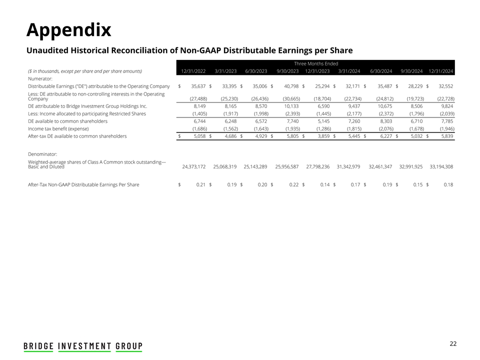附录截至三个月的非GAAP可分配每股收益的未经审计的历史调节(千美元,每股除外和每股金额)12/31/20223/31/20236/30/20239/30/202312/31/20233/31/20246/30/20249/30/202412/31/2024分子:归属于运营公司的可分配收益(DE)$ 35,637 $ 33,395 $ 35,006 $ 40,798 $ 25,294 $ 32,171 $ 35,487 $ 28,229 $ 32,552减:归属于运营公司非控股权益的DE(27,488)(25,230)(26,436)(30,665)(18,704)(22,734)(24,812)(19,723)(22,728)归属于Bridge Investment Group Holdings Inc.的DE 8,1498,1658,57010,1336,596,2486,5727,7405,1457,2608,3036,7107,785所得税优惠(费用)(1,686)(1,562)(1,643)(1,935)(1,286)(1,815)(2,076)(1,678)(1,946)普通股股东可获得的税后DE5,058美元4,686美元4,929美元5,805美元3,859美元5,445美元6,227美元5,032美元5,839分母数:已发行A类普通股加权平均股——基本和稀释后24,373,17225,068,31925,143,28925,956,58727,798,23631,342,97932,461,