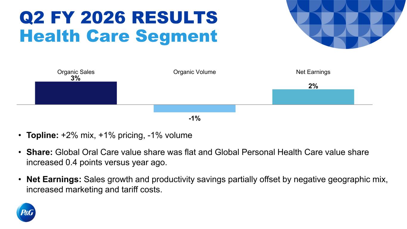 3%-1 %2%有机销售有机量净收益2026财年第二季度结果医疗保健部门•营收:+ 2%组合,+ 1%定价,-1 %量•份额:全球口腔护理价值份额持平,全球个人医疗保健价值份额较去年同期增长0.4个百分点。•净收益:销售增长和生产力节省部分被负面的地域组合、营销和关税成本增加所抵消。