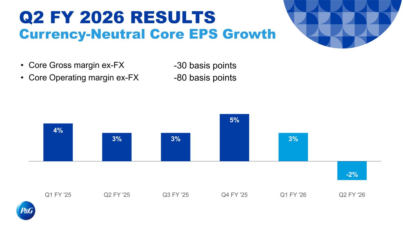 第二季度业绩受到基期动态和基本市场趋势的严重影响。有机销售额与上年持平。定价+ 1%被销量-1 %抵消。本季度10个产品类别中有7个增长或保持有机销售额。全球总价值份额下降了20个基点,我们排名前50的类别/国家组合中有25个在本季度持有或增加了份额。核心每股收益为1.88美元,与上年持平。在货币中性的基础上,核心每股收益为1.85美元。2026财年第二季度业绩