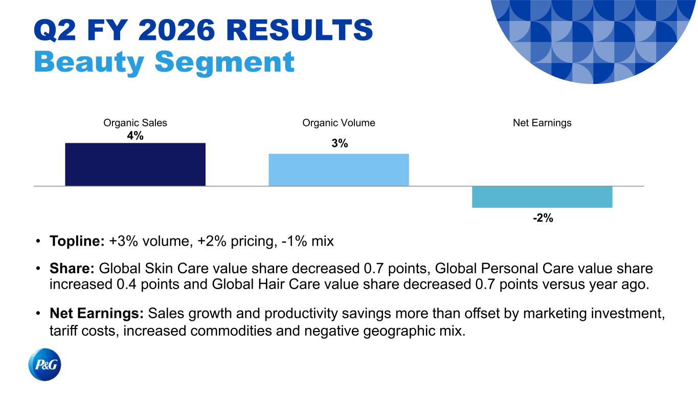 4% 3%-2 %有机销售有机量净收益• Topline:+ 3%的销量、+ 2%的定价、-1 %的组合•份额:全球护肤价值份额下降0.7个点,全球个人护理价值份额上升0.4个点,全球护发价值份额同比下降0.7个点。•净收益:销售增长和生产力节省被营销投资、关税成本、商品增加和负面的地域组合所抵消。2026财年第二季度业绩美容部门