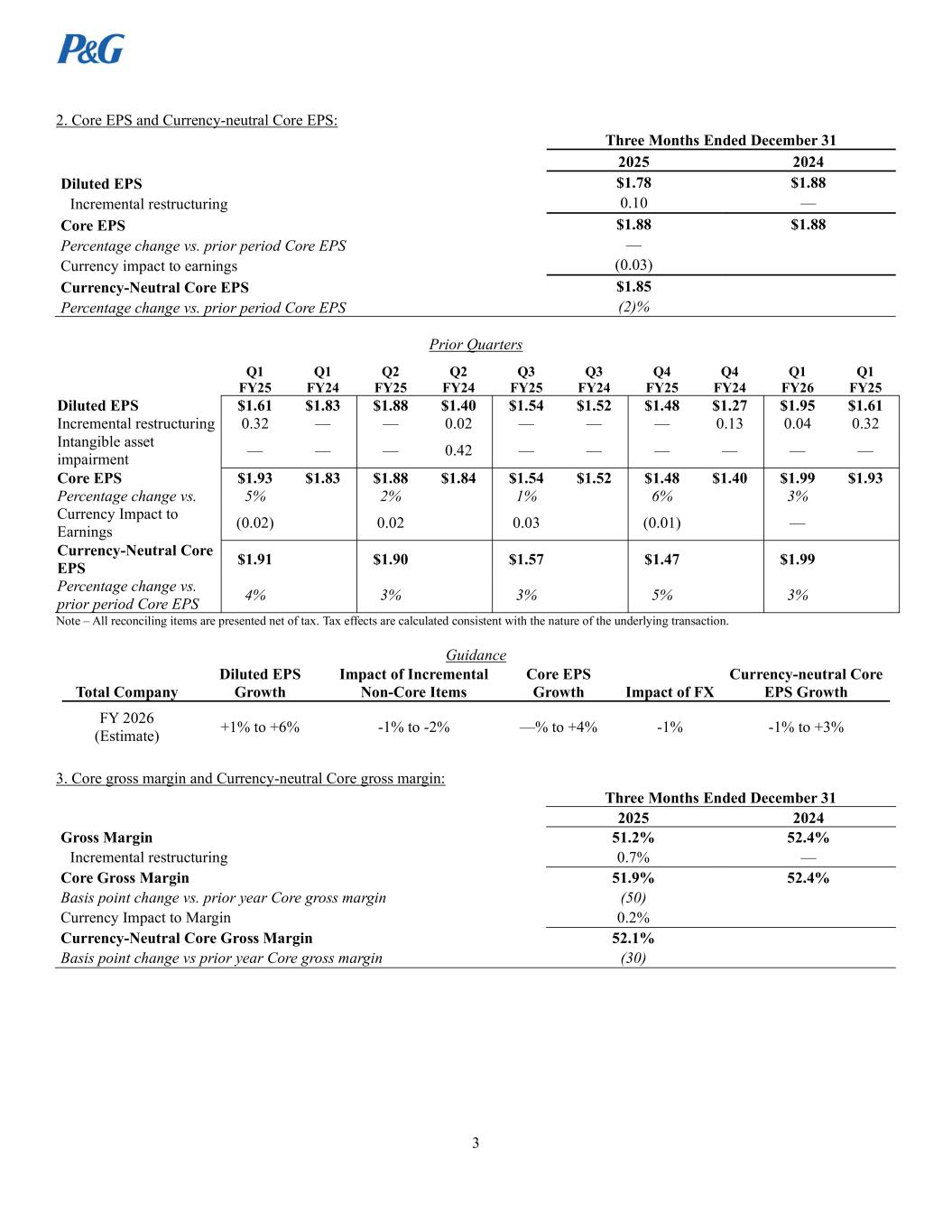 1 宝洁公司条例G非公认会计原则衡量标准的调节下文提供了宝洁 2026年1月22日财报电话会议、相关幻灯片和其他材料中使用的非公认会计原则衡量标准的定义,以及与最密切相关的公认会计原则衡量标准的调节。我们认为,这些非GAAP衡量标准为基本业务趋势(即不包括非经常性或不寻常项目的趋势)和结果提供了有用的视角,并提供了同比结果的补充衡量标准。下文所述的非公认会计原则措施被管理层用于做出经营决策、分配财务资源和用于业务战略目的。这些措施可能对投资者有用,因为它们提供了有关业务表现的补充信息,并通过管理层的眼睛为投资者提供了我们业务结果的观点。这些措施中的某些措施也被用来评估高级管理层,并且是确定他们面临风险的薪酬的一个因素。这些非公认会计原则措施无意被用户视为替代相关公认会计原则措施,而是作为我们业务结果的补充信息。由于方法和被调整的项目或事件可能存在差异,这些非GAAP衡量标准可能与其他公司使用的类似衡量标准不同。该公司无法协调其前瞻性的非GAAP现金流和有效的税率措施,因为该公司无法预测收购和资产剥离等离散项目的时间和金额,这可能会对GAAP业绩产生重大影响。请注意,某些列和行可能由于四舍五入的原因而没有相加。规定了以下措施:1。有机销售增长—第2页2。核心EPS和货币中性核心EPS ——第3页3。核心毛利率和货币中性核心毛利率—第3页4。核心营业利润率和货币中性核心营业利润率—第4页5。调整后的自由现金流和调整后的自由现金流生产率——第4页以下调节表中包含的核心收益衡量标准是指适用于以下项目的调整后的等效GAAP衡量标准:增量重组:公司历来的持续重组活动水平约为税前250至5亿美元。2025年6月5日,该公司宣布了一项产品组合和生产力计划,以精简其产品组合和组织,以改善其成本结构和竞争力。在截至2024年6月30日的财政年度,公司开始对其业务运营进行有限的市场组合重组,主要是在某些企业市场,包括阿根廷和尼日利亚,以应对具有挑战性的宏观经济和财政状况。截至2024年9月30日止期间,公司完成了这一有限的市场投资组合重组,其在阿根廷的业务大幅清算。对核心收益的调整包括超过正常、经常性重组费用水平的重组费用。无形资产减值:在2024财年,公司确认了10亿美元的非现金税后减值费用(税前13亿美元),用于调整作为公司2005年收购吉列公司的一部分而获得的吉列无形资产的账面价值。我们不认为上述项目是我们可持续业绩的一部分,将其排除在核心收益衡量标准之外提供了更具可比性的同比业绩衡量标准。在评估高级管理层确定其风险补偿时,这些项目也被排除在外。有机销售增长:有机销售增长是一种非公认会计准则下的销售增长衡量标准,不包括收购和资产剥离的影响以及同比比较中的外汇。我们认为,这一衡量标准通过提供一致的销售增长,为投资者提供了对潜在销售趋势的补充理解。这一措施也被用于评估风险补偿管理目标的实现情况。核心每股收益和货币中性核心每股收益:核心每股净收益,或核心每股收益, 是按所示项目调整的稀释后每股普通股净收益(稀释后EPS)的衡量标准。货币中性的核心EPS是衡量公司核心EPS的指标,剔除了当年汇兑的增量影响。管理层将这些非公认会计准则衡量标准视为公司业绩随时间推移的有用补充衡量标准。这些措施也用于评估风险补偿管理目标的实现情况。核心毛利率和货币中性核心毛利率:核心毛利率是衡量公司按所示项目调整后的毛利率。货币中性的核心毛利率是衡量公司核心毛利率的指标,不包括汇兑的当年增量影响。管理层认为,随着时间的推移,这些非公认会计准则衡量标准为公司的运营效率提供了补充视角。