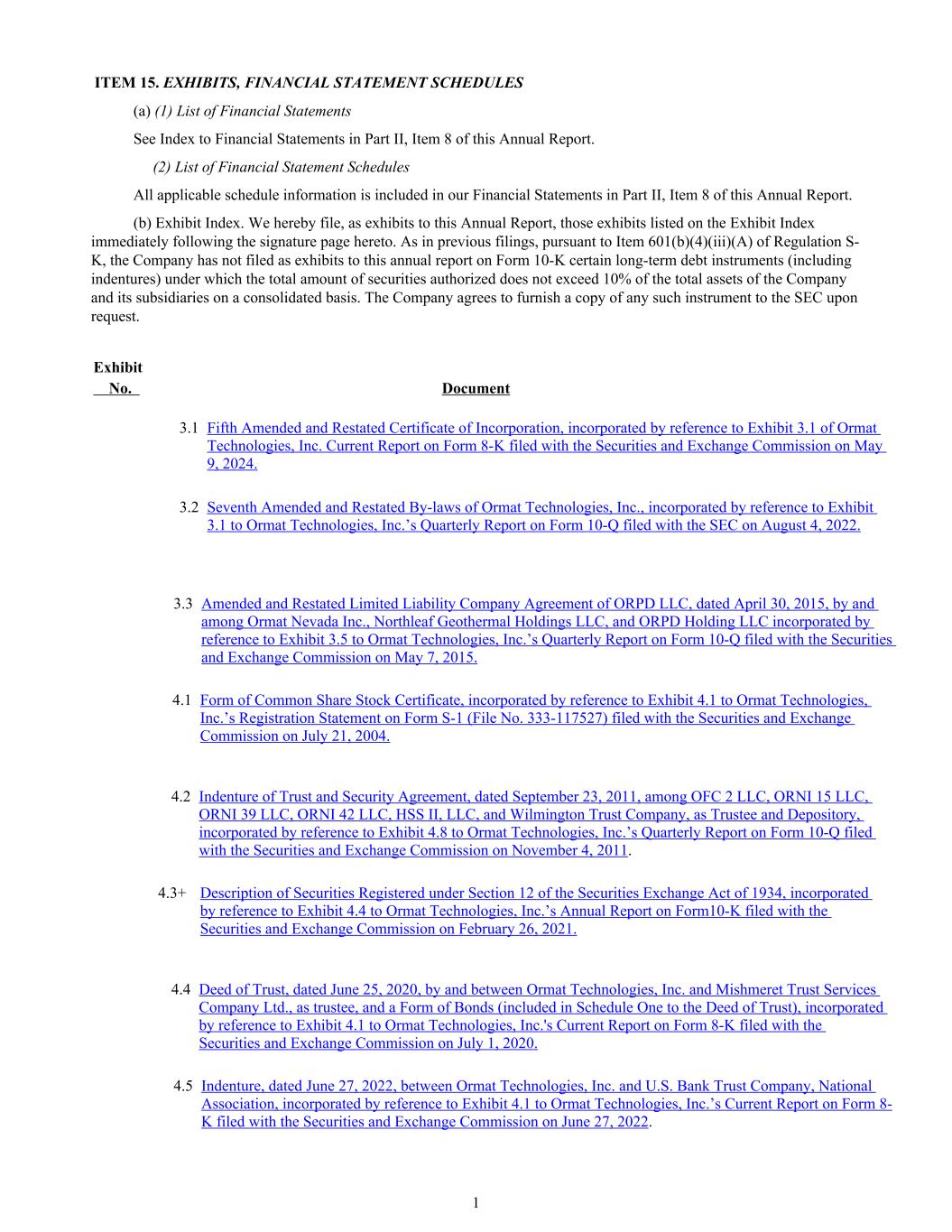 项目15。展览、财务报表附表(a)(1)财务报表一览表见本年度报告第二部分第8项财务报表索引。(2)财务报表附表清单所有适用的附表信息均包含在本年度报告第二部分第8项的财务报表中。(b)附件指数。我们特此归档,作为本年度报告的展品,紧随其后的签名页被列在附件索引中的那些展品。与以往提交的文件一样,根据S-K条例第601(b)(4)(iii)(a)项,公司并未以表格10-K提交某些授权证券总额不超过公司及其附属公司综合基础上总资产的10%的长期债务工具(包括契约)作为本年度报告的证据。公司同意应要求向SEC提供任何此类文书的副本。附件编号文件3.1第五次修订和重述的公司注册证书,通过引用于2024年5月9日向美国证券交易委员会提交的8-K表格的Ormat Technologies, Inc.当前报告的附件 3.1并入。3.2第七次修订和重述的《Ormat Technologies, Inc.章程》,通过引用附件 3.1并入Ormat Technologies, Inc.于2022年8月4日向SEC提交的10-Q表格季度报告。3.3 Ormat Nevada Inc.、Northleaf Geothermal Holdings LLC和ORPD Holding LLC于2015年4月30日修订并重述了ORPD LLC的有限责任公司协议,该协议由Ormat Nevada Inc.、Northleaf Geothermal Holdings LLC和ORPD Holding LLC通过引用附件 3.5并入Ormat Technologies, Inc.于2015年5月7日向美国证券交易委员会提交的表格10-Q的季度报告。4.1普通股股票证书的表格,通过引用附件 4.1并入Ormat Technologies, Inc.于 2004年7月21日向美国证券交易委员会提交的S-1表格(文件编号:333-117527)上的注册声明。4.2作为受托人和存管人的OFC 2 LLC、ORNI 15 LLC、ORNI 39 LLC、ORNI 42 LLC、HSS II,LLC和Wilmington Trust Company之间日期为2011年9月23日的信托和担保协议契约,该契约通过引用附件 4.8并入Ormat Technologies, Inc.于2011年11月4日向证券交易委员会提交的表格10-Q的季度报告。4.3 +根据1934年《证券交易法》第12条注册的证券说明,通过引用将附件 4.4并入Ormat Technologies, Inc.于2021年2月26日向美国证券交易委员会提交的Form10-K年度报告。4.4由作为受托人的奥玛特科技,Inc.与Mishmeret Trust Services Company Ltd.签署的日期为2020年6月25日的信托契约,以及一份债券表格(包括在信托契约的附表一中),该表格通过引用并入附件至Ormat Technologies, Inc.于2020年7月1日向美国证券交易委员会提交的关于表格8-K的当前报告。4.5 Indenture,dated June 27,2022,between 奥玛特科技,Inc. and U.S. Bank Trust Company,National Association,by reference to 附件 4.1 to Ormat Technologies, Inc.于2022年6月27日向美国证券交易委员会提交的关于表格8-K的当前报告。1