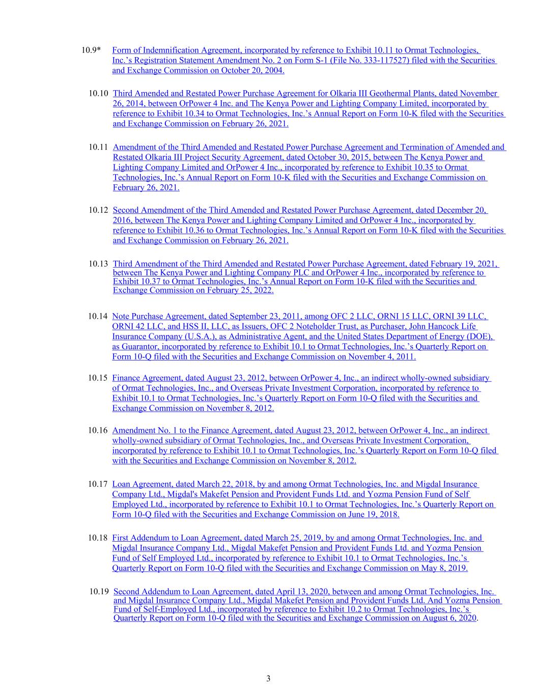 10.9*赔偿协议表格,通过引用附件 10.11并入丨Ormat Technologies, Inc.于2004年10月20日向美国证券交易委员会提交的关于表格S-1(文件编号:333-117527)的第2号注册声明修订。10.10 OrPower 4 Inc.与The Kenya Power and Lighting Company Limited于2014年11月26日就Olkaria III地热厂签订的第三份经修订和重述的购电协议,该协议通过引用附件 10.34并入Ormat Technologies, Inc.于2021年2月26日向美国证券交易委员会提交的10-K表格年度报告。10.11 Kenya Power and Lighting Company Limited与OrPower 4 Inc.于2015年10月30日修订第三份经修订和重述的购电协议以及终止经修订和重述的Olkaria III项目担保协议,并通过引用附件 10.35并入Ormat Technologies, Inc.于2021年2月26日向美国证券交易委员会提交的10-K表格年度报告。10.12 Kenya Power and Lighting Company Limited与OrPower 4 Inc.于2016年12月20日对第三次经修订和重述的购电协议进行第二次修订,通过引用附件 10.36并入Ormat Technologies, Inc.于2021年2月26日向美国证券交易委员会提交的10-K表格年度报告。10.13肯尼亚电力和照明公司PLC与OrPower 4 Inc.于2021年2月19日对第三次经修订和重述的电力购买协议进行了第三次修订,该协议通过引用附件 10.37并入Ormat Technologies, Inc.于2022年2月25日向美国证券交易委员会提交的10-K表格年度报告。10.14票据购买协议,日期为2011年9月23日,由作为发行人的OFC 2 LLC、ORNI 15 LLC、ORNI 39 LLC、ORNI 42 LLC和HSS II,LLC、作为买方的OFC 2票据持有人信托、作为行政代理人的John Hancock Life Insurance Company(U.S.A.)以及作为担保人的美国能源部(DOE)之间签订,通过引用附件附件 10.1并入到TERM0 Ormat Technologies,Inc. Ormat Technologies, Inc.于2011年11月4日向美国证券交易委员会提交的表格10-Q的季度报告。10.15《融资协议》,日期为2012年8月23日,由Ormat Technologies, Inc.的间接全资附属公司OrPower 4,Inc.与Overseas Private Investment Corporation订立,该协议通过引用附件 10.1并入Ormat Technologies, Inc.于2012年11月8日向美国证券交易委员会提交的表格10-Q的季度报告。10.16 Ormat Technologies, Inc.的间接全资子公司OrPower 4,Inc.与Overseas Private Investment Corporation于2012年8月23日对融资协议进行的第1号修订,该修订以引用方式并入附件至Ormat Technologies, Inc.于2012年11月8日向美国证券交易委员会提交的表格10-Q的季度报告。10.17贷款协议,日期为2018年3月22日,由奥玛特科技,Inc.和Migdal Insurance Company Ltd.、Migdal的Makefet Pension and Provident Funds Ltd.和Yozma Pension Fund of Self Employed Ltd.签署,并由他们之间签署,该协议通过引用附件 10.1并入Ormat Technologies, Inc.于2018年6月19日向美国证券交易委员会提交的表格10-Q的季度报告。10.18 奥玛特科技,Inc.与Migdal Insurance Company Ltd.、Migdal Makefet Pension and Provident Funds Ltd.和Yozma Pension Fund of Self Employed Ltd.于2019年3月25日签署的贷款协议第一次增编,通过引用附件 10.1并入Ormat Technologies, Inc.于2019年5月8日向美国证券交易委员会提交的表格10-Q的季度报告。10.19 奥玛特科技,Inc.与Migdal Insurance Company Ltd.、Migdal Makefet Pension and Provident Funds Ltd.和Yozma Pension Fund of Self-Employed Ltd.之间日期为2020年4月13日的贷款协议第二份增编,通过引用将附件0.2于2020年8月6日向美国证券交易委员会提交的表格10-Q的季度报告并入TERM1 10.2。3